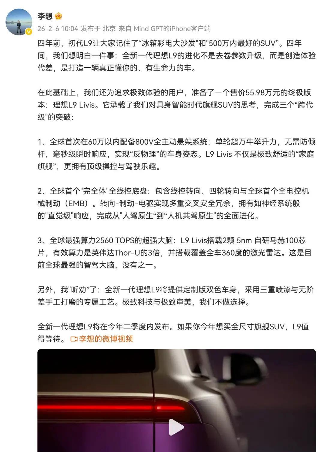 2026年2月,北京,理想汽车创始人李想突然放出大招:全新一代L9即将在二季度亮相,其中顶配Livis版直接定价55.98万元,这价格一出就让不少人直呼“家庭旗舰要卷疯了”。这款Livis版主打三大硬核升级,直接把体验拉到跨代水平。首先是全球首搭800V全主动悬架,60万以内罕见,单轮力量超万牛,刹车几乎不点头,过弯侧倾小到夸张,开起来像小车一样灵活却稳如老狗。其次是全球首个“完全体”全线控底盘,线控转向+四轮转向+全电控制动全上阵,响应快到毫秒级,安全性直接多重冗余,就算极端情况也能稳住。最炸裂的是算力,搭载两颗理想自研5nm马赫100芯片,总算力高达2560 TOPS,相当于英伟达Thor-U的三倍,配上360度激光雷达,智驾大脑直接封神,车子从工具变身懂你的智能伙伴。动力部分也升级,新1.5T增程器热效率更高,电池容量提到73kWh左右,纯电续航410km,综合续航轻松破1400km。外观上还有定制双色车身、三色星环灯、22寸轮毂,整体科技感拉满。相比现款2025款L9起售40.98万、顶配43.98万,Livis版贵了12万,但配置跨度大到不像一个级别。去年L9月均销量不到4000辆,确实不算爆款,可这次升级后如果其他版本价格稳住,竞争力瞬间爆表,家庭用户真有可能被它重新定义“大沙发”新高度。