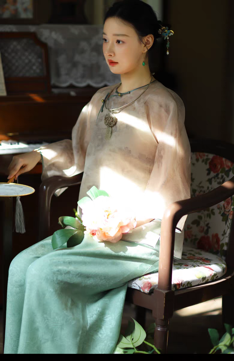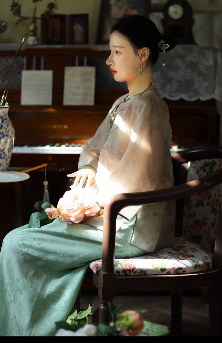 25夏新款丹青入画真丝印花欧根纱圆领斜襟短款上衣复古新中式小衫