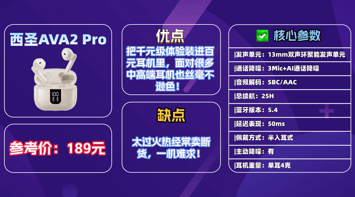 推荐产品1、西圣AVA2 Pro蓝牙耳机(价格:189元)