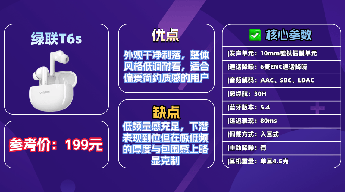 推荐产品3、绿 联T 6s蓝牙耳机