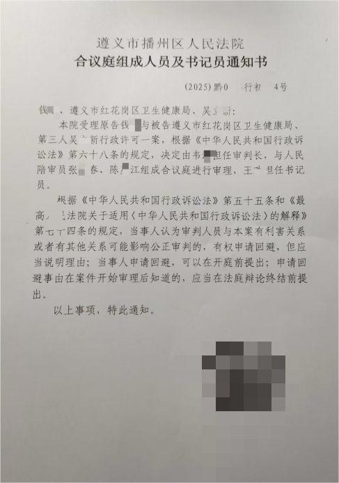 为从根本上质疑罚款的合法性基础,钱先生转换诉讼策略,于2025年9月,以“行政许可程序违法”为由,将最初核发《医疗机构执业许可证》的遵义市红花岗区卫生健康单位诉至遵义市播州区审判单位,案件定于2025年12月9日开庭。