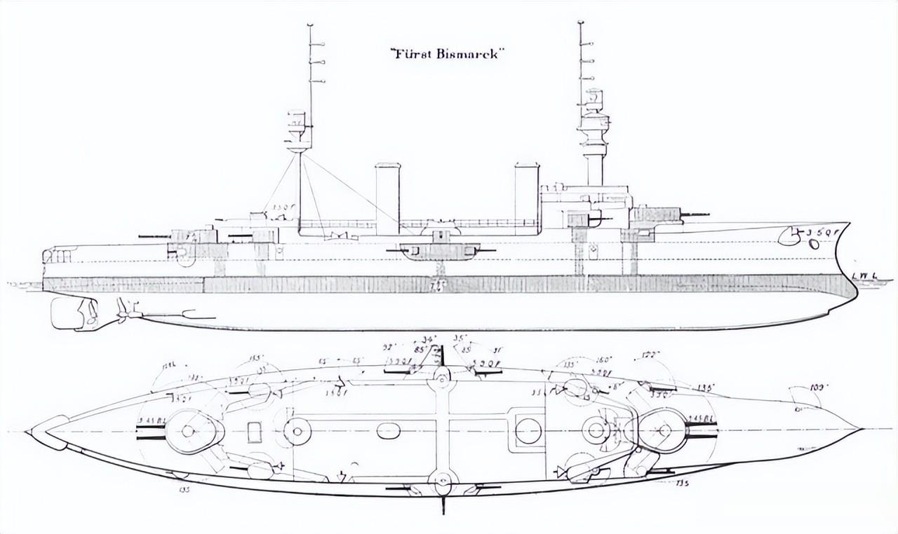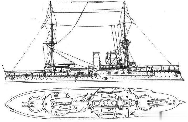 “俾斯麦侯爵”号装甲巡洋舰线图,排水量10690吨,装备4门240毫米主炮,12门150毫米副炮