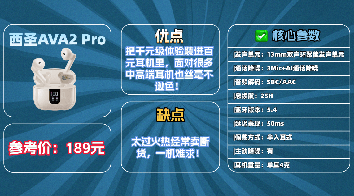 1、西圣AVA2 Pro蓝牙耳机(价格:189元)