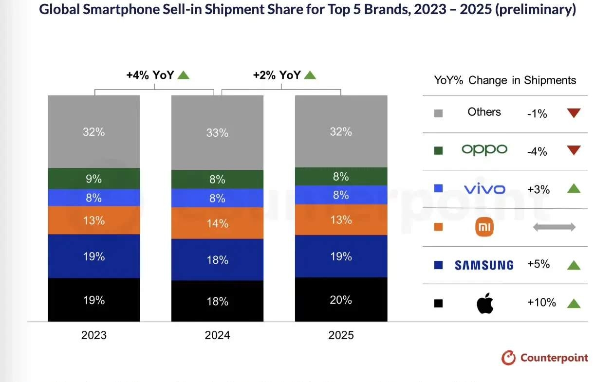 2025年全球智能手机销量排行正式揭晓,苹果以20%的市场份额首次超越三星登顶榜首,三星以19%份额紧随其后,小米凭借13%份额稳守第三,华为则遗憾未能跻身前五。榜单一经公布,“看看最近爆火的iPhone 4就知道了”的声音刷屏社交平台,网友普遍认为这份排名贴合品牌实力,苹果的登顶绝非偶然。