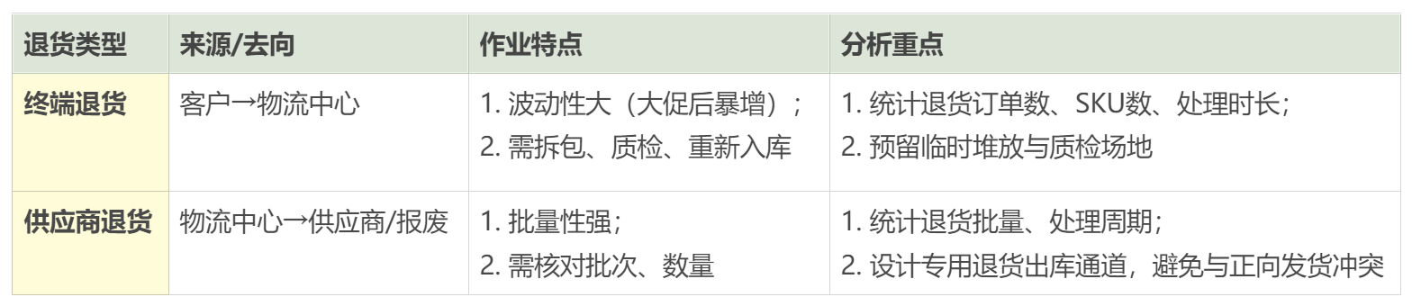 它的作业不规律,可能某天突然涌进来一大批。所以,在数据上要把“退货接收”和“退货后续处理”的数据分开统计,因为它们需要的场地和人手节奏不同。