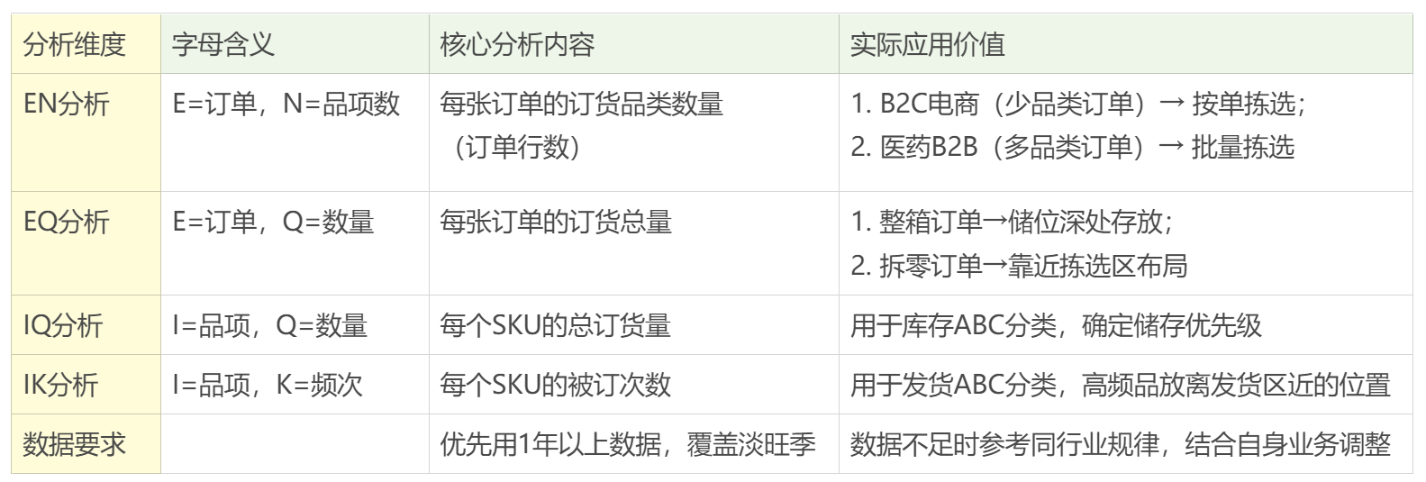 它是决定仓库如何布局、用什么拣货策略的顶层依据。我建议你做分析时最好用上一整年的数据,这样才看得出季节性规律,分析结果也更有说服力。