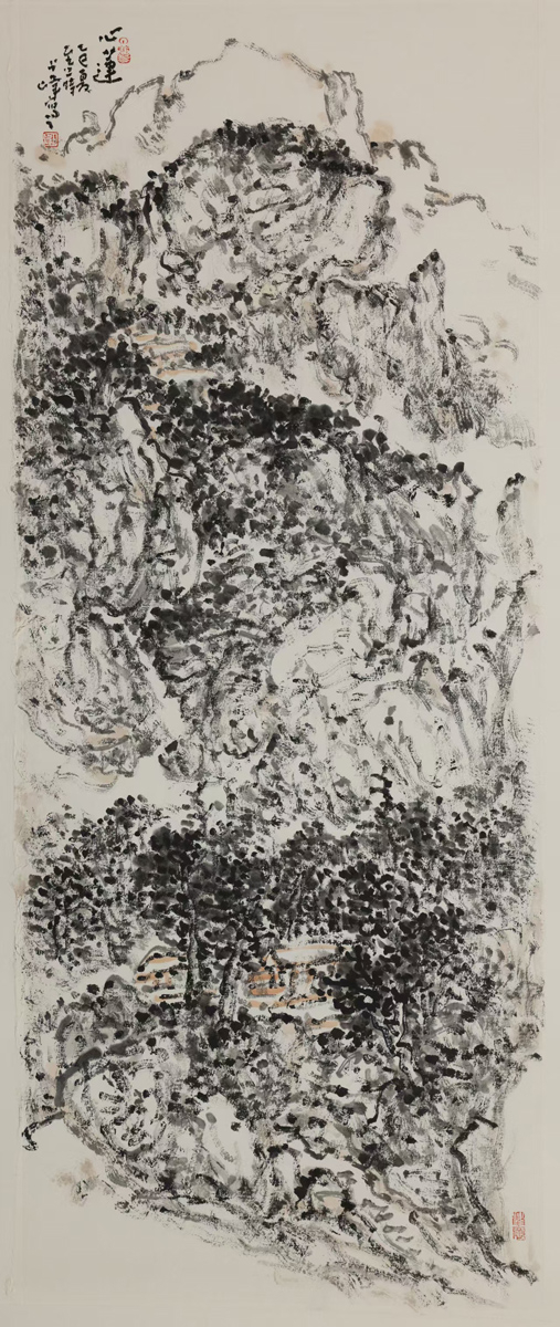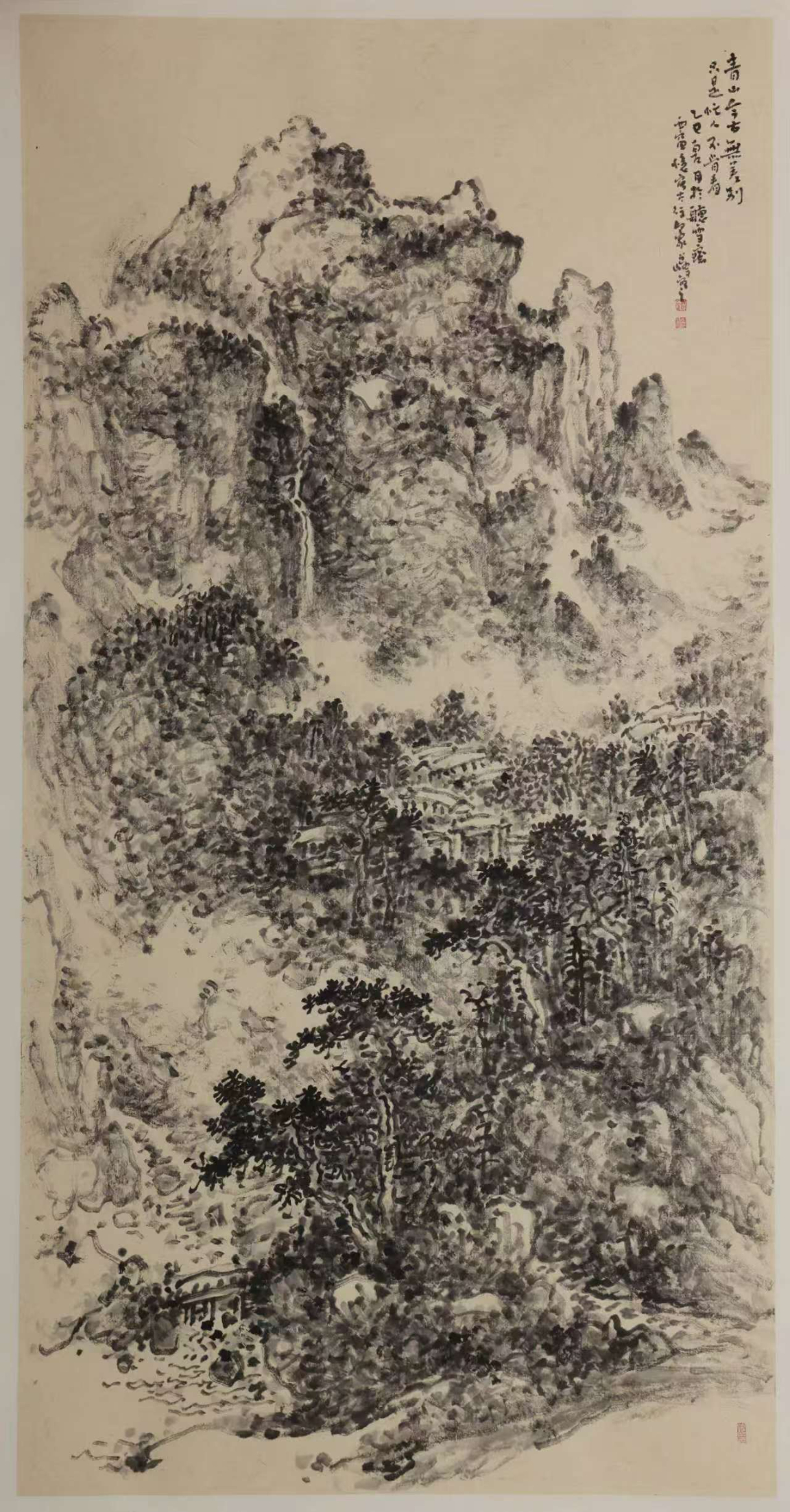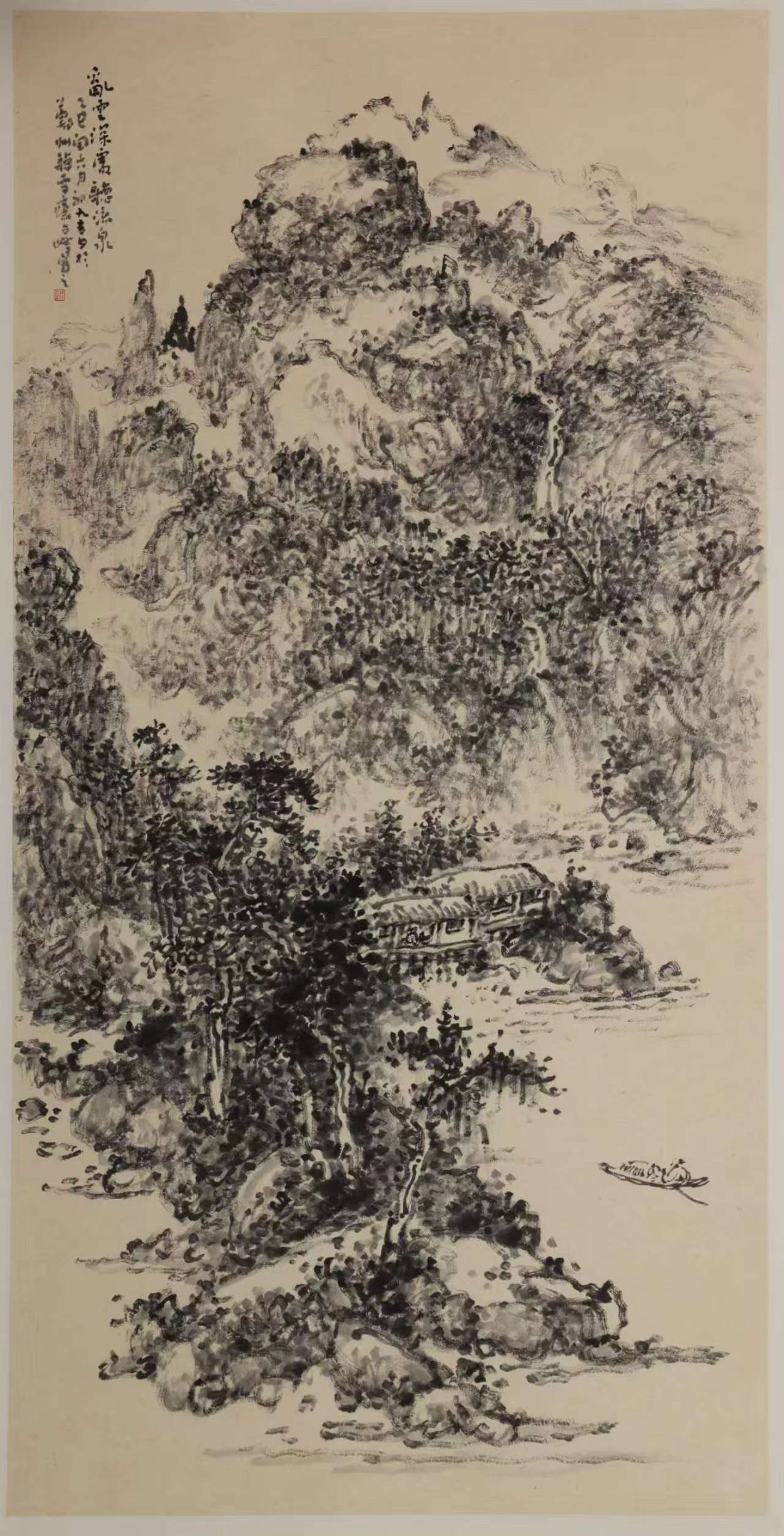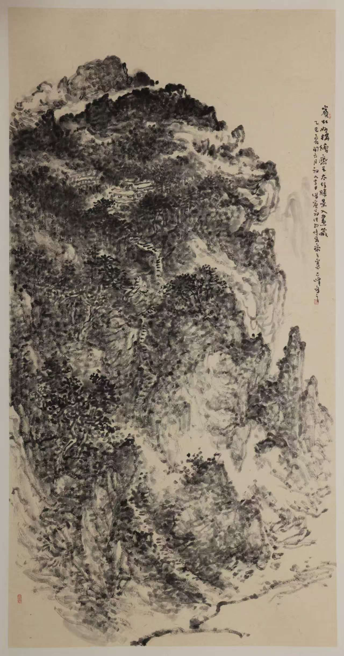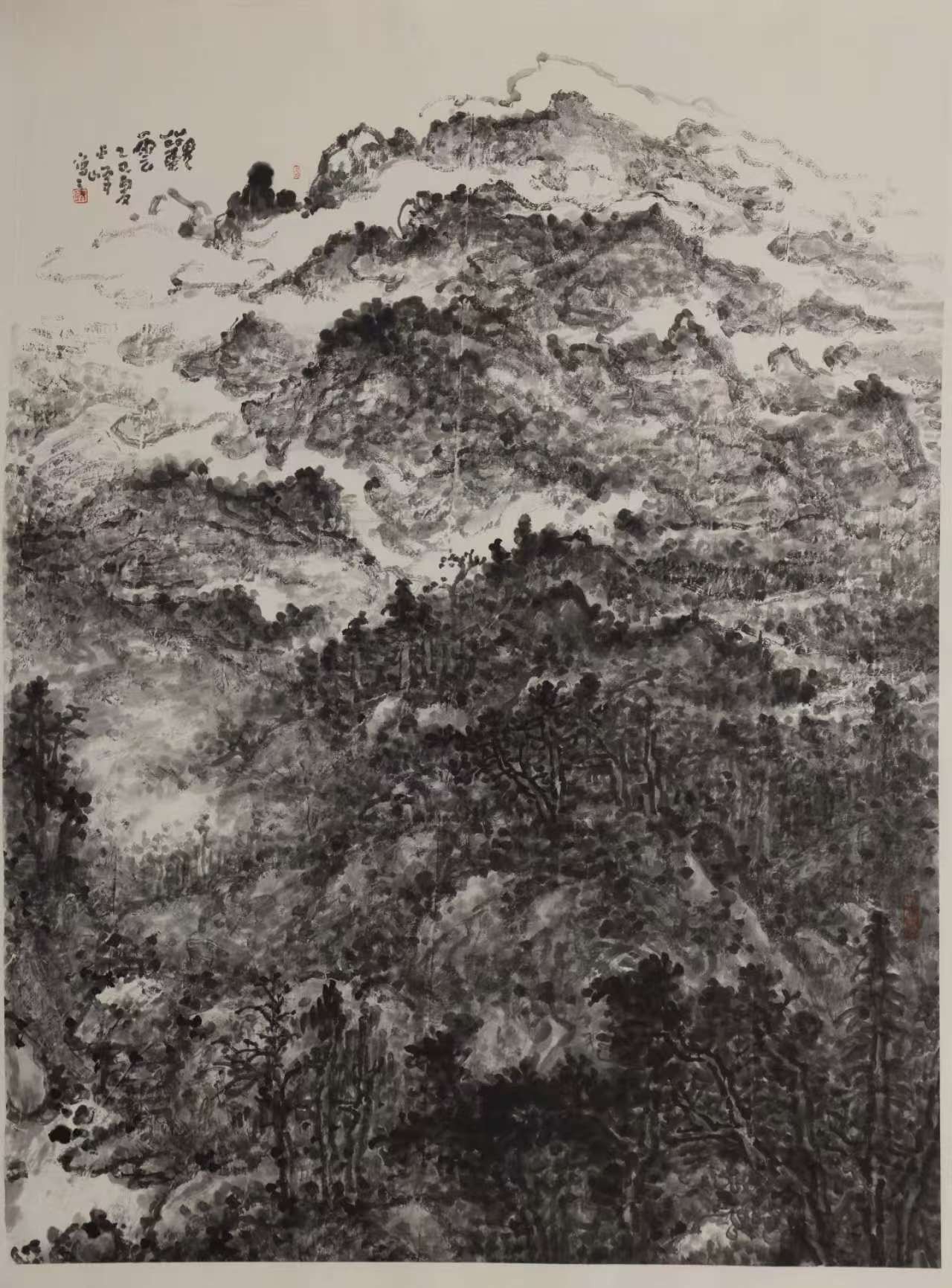 瞧那峰峦,墨色从浅灰悠悠漫向浓黑,并非单调的重复堆砌,而是“墨分五色”的鲜活演绎。焦墨,是崖尖那冷峻的卫士,带着太行的刚硬与不屈,傲立云端;浓墨,是林麓那茂密的丛林,每一笔都写满了生命的繁茂与喧嚣;重墨,是石缝那幽深的秘密,藏着岁月的沧桑与故事的回响;淡墨,是云边那轻柔的梦呓,飘荡着空灵与悠远的思绪;清墨,是溪畔那温润的月光,流淌着宁静与祥和的温柔。这便是他积墨技法的精妙绝伦之处:以墨为砖,层层垒起溪山的厚重与巍峨,却又不让山陷入沉闷与死寂。留白的云气,宛如灵动的精灵,从墨缝间轻盈漫出,恰似山的呼吸,轻软得仿佛能托住那皎洁的月光,让整座山都充满了生机与活力。