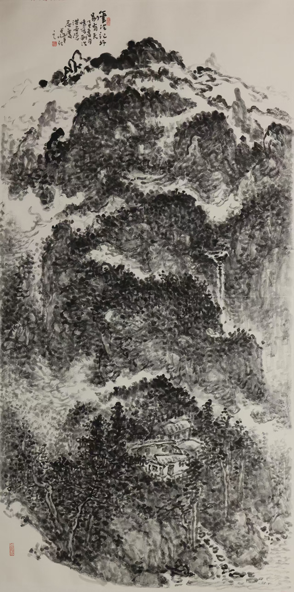 他的墨,是山的骨血,是岁月长河中沉淀的诗篇。淡墨,宛如山初醒时的慵懒眼眸,晕开之际,裹挟着晨雾的轻柔软糯,似一层薄纱,轻覆在山的肩头;浓墨,恰似山沉眠时的深沉呼吸,积叠之处,凝结着暮色的浓郁醇厚,如一块重石,稳稳地压在山的心底;而那层层积染的墨色,则是山不朽的年轮,一圈又一圈,层层叠叠,仿佛岁月这位雕刻大师,在崖壁上精心刻下的不朽诗行。