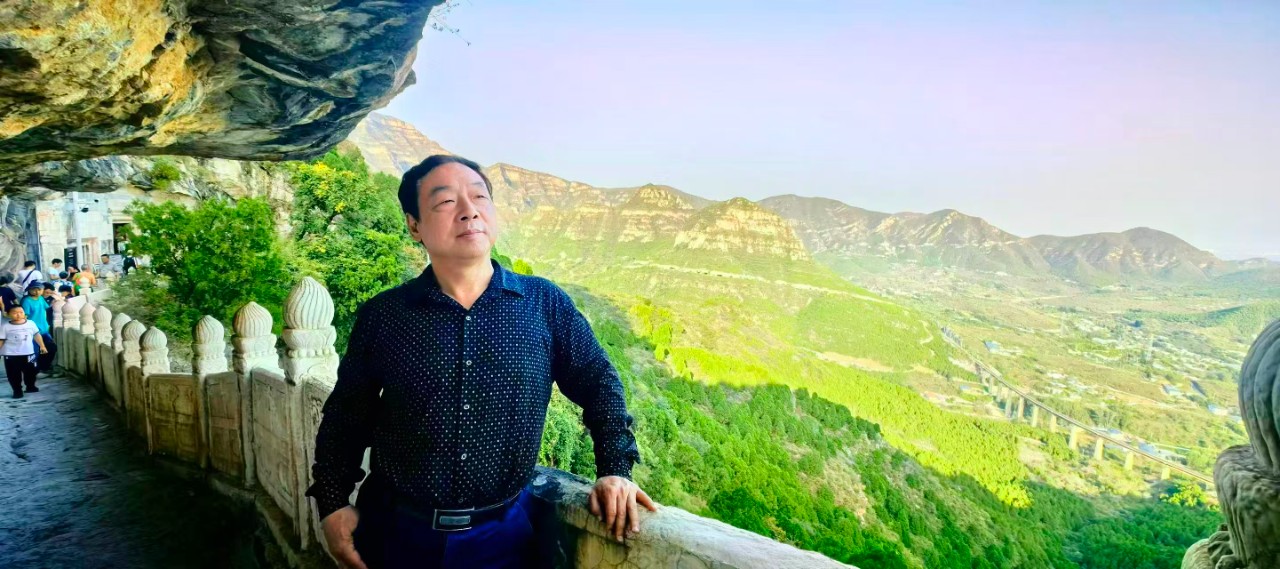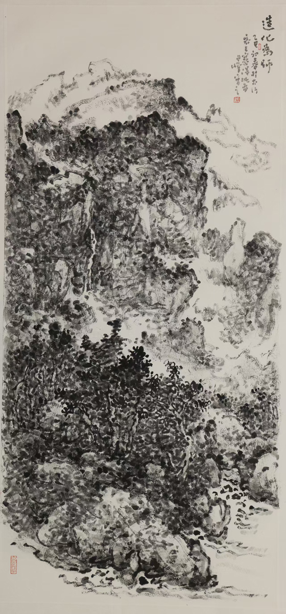 他的笔,是风的刻刀,是时光的画笔,在宣纸上勾勒出世间万象。斧劈皴的劲挺,是崖壁那坚硬的骨骼,每一道笔触都带着太行的雄浑与豪迈,仿佛能听见山风呼啸而过,吹过那陡峭的崖壁,发出震耳欲聋的声响;披麻皴的缠柔,是林麓那细腻的肌肤,每一缕线条都缠绕着溪谷的幽深与静谧,宛如一位温柔的少女,在幽静的山谷中翩翩起舞;而点染的苔痕,是山那灵动的痣,星星点点,散落在山间,似雨打在石上的斑驳印记,又似露凝在叶间的晶莹光芒,为山增添了几分俏皮与可爱。墨的沉郁与笔的刚劲相互碰撞,便撞出了山那独特的风骨——既有“巍巍耸立天”的壮阔豪迈,又有“云气缠峰尖”的灵动秀逸;刚如崖石崩裂,势不可挡,柔如云絮绕枝,缠绵悱恻。