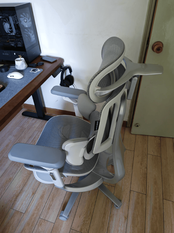 Flow360主打“随动支撑”,腰靠能完整包裹下腰和尾椎区域,无论正坐还是后仰,腰部都能紧贴靠背曲线,避免悬空。椅背最大后仰可达150°,靠躺时身体自然放松,午休也舒适。坐垫采用绒感网布,柔软透气、回弹力适中,长时间坐也不塌陷。扶手多方向可调,操作方便。整椅出厂预装,开箱即可使用,调节顺手。安全方面,使用4级防爆气压杆并通过BIFMA认证,结构稳固可靠。细节上,头枕在正坐时支撑略显不足,座深对高个用户稍短,但整体坐感轻盈、腰背支撑精准,适合长时间办公和偶尔休息的用户。