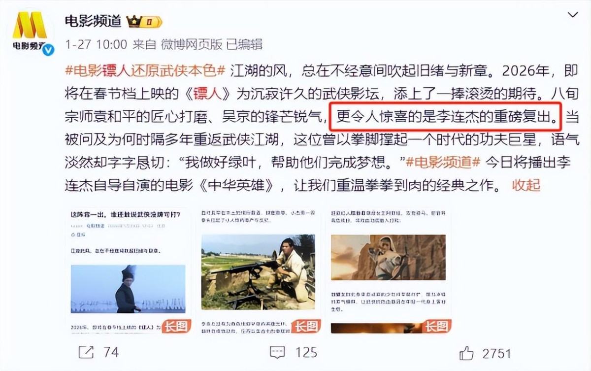 紧接着,吴京的新电影《镖人》官宣,李连杰的名字赫然在列。