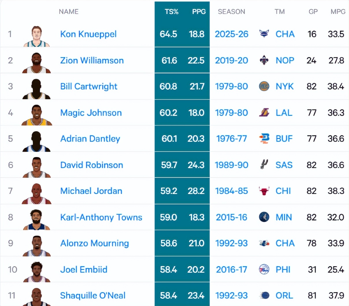 📌 历史级开局克内佩尔目前成为 NBA 历史上仅有 5 位新秀之一:能场均至少 18 分 + 60% 以上真实命中率(TS%)。
