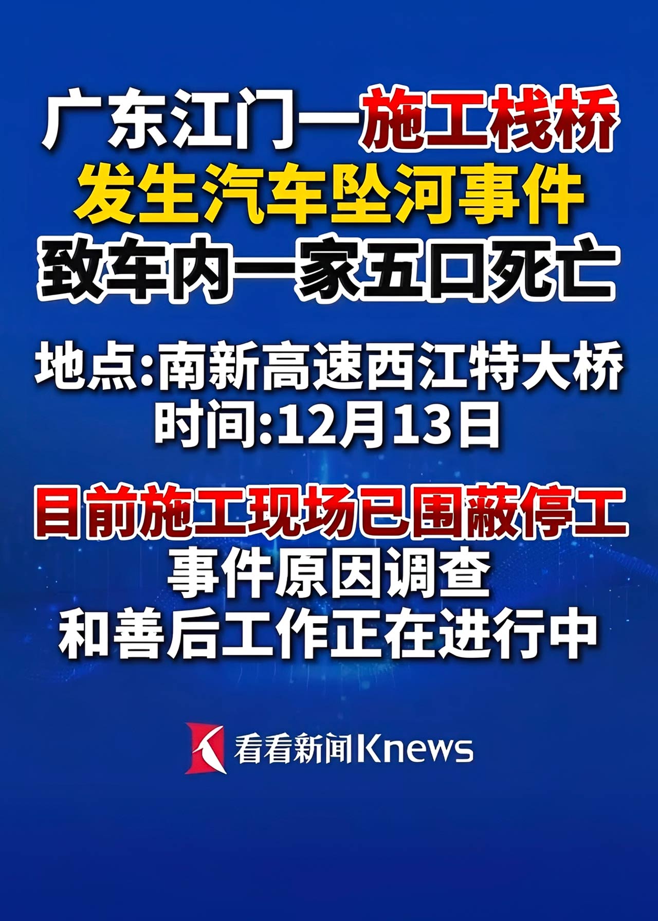 12月13日13时许,一辆载有广州游客的车辆驶入该施工栈桥区域。这个施工点没有任何安全围栏及阻拦设施,车辆直接坠入西江。事发次日,坠河车辆被成功打捞,不幸的是,车内5人全部遇难。遇难者包括4名成人和1名儿童。事发地点是南海至新会高速公路配套西江特大桥的施工现场。2025年4月起,大桥江门岸施工栈桥等配套设施进入集中施工阶段。此次事发的无防护路段,正是该项目衔接主桥施工的临时通行便道,平时仅供施工车辆进出。