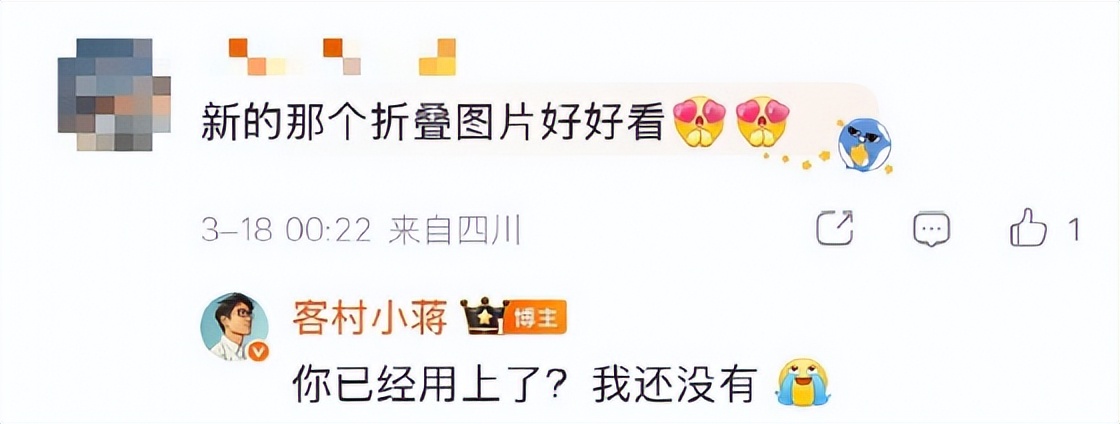 而对于此次折叠发图功能,客村小蒋在微博上与网友互动时称:“你已经用上了?我还没有。”
