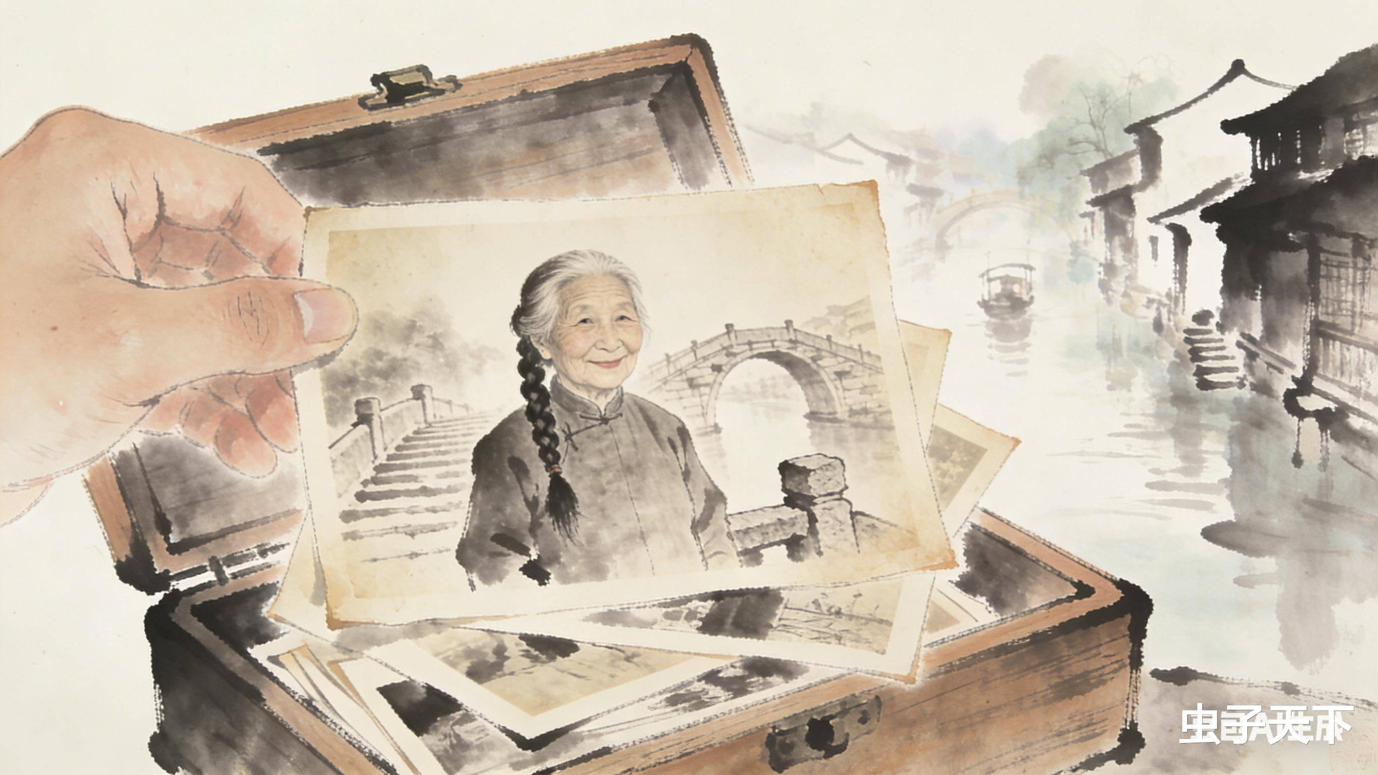 最上面的一张,是年轻时的奶奶,梳着两条麻花辫,穿着蓝布衫,站在乌镇的石桥上,笑得眉眼弯弯。