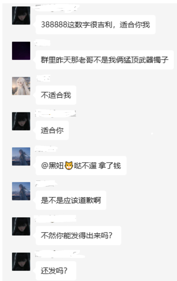 事件的起因是一位女玩家在副本结束后参与装备竞拍,不料被其他玩家顶价截胡。因觉得自己最终分到的收益减少,这位女玩家直接在帮会群中公开对峙,强硬要求顶价的神豪玩家出面道歉。令人意外的是,神豪为平息争端,向其转账了38.8万元红包作为补偿,但该女玩家仍不罢休,依旧在群内持续争执。