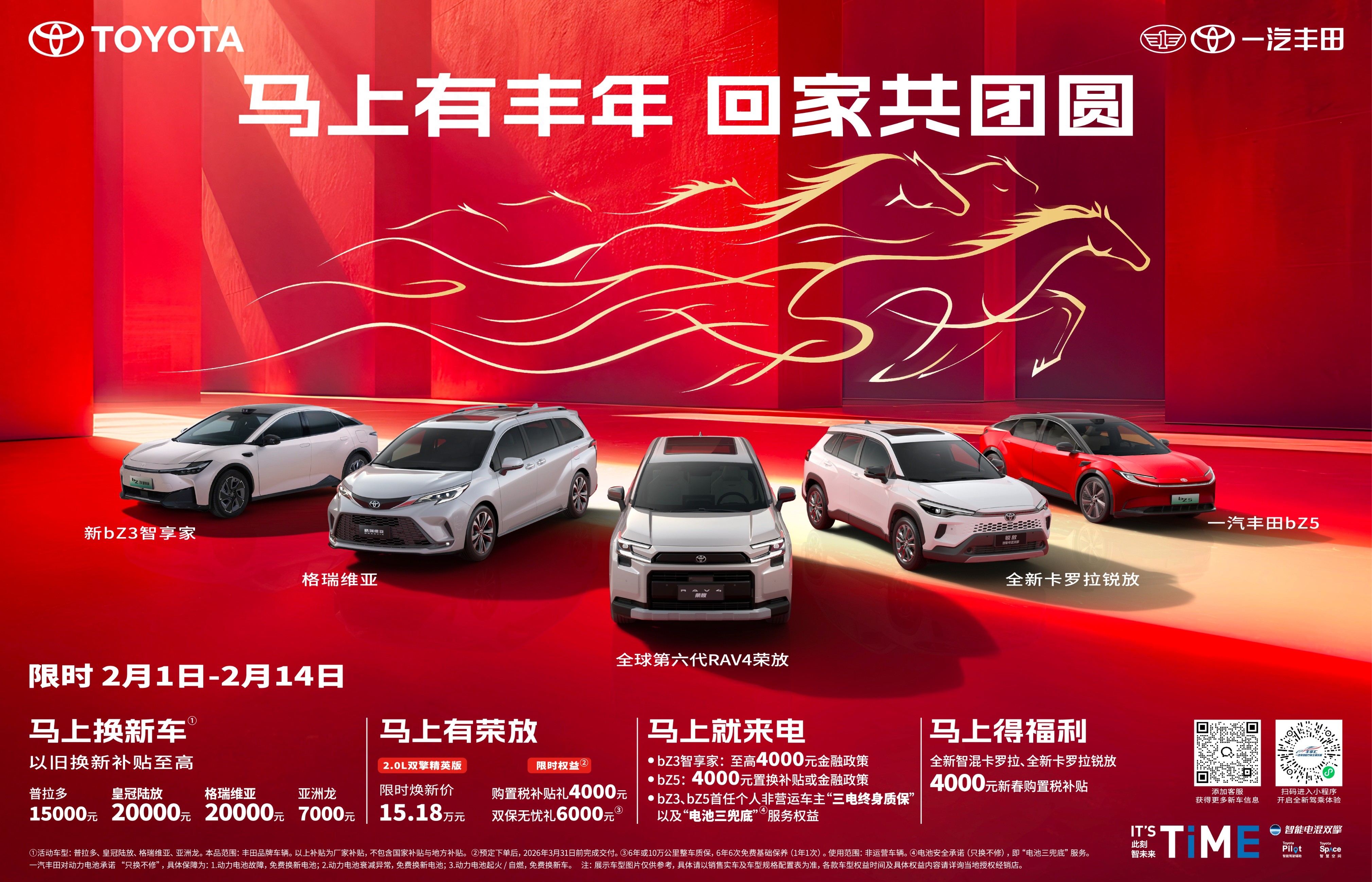 年味渐浓,归途可期。一汽丰田以一份诚挚礼遇,守护每个家庭的团圆之旅。2月1日至2月14日,一汽丰田推出限时活动,皇冠陆放、格瑞维亚等明星车型享至高20000元的置换补贴;全新第六代荣放限时焕新价15.18万元起,并可享4000元的购置税补贴和6000元的双保无忧礼;纯电“双子星”bZ3智享家和bZ5至高享4000元购车补贴和“三电终身质保”“电池三兜底”的服务权益;全新智混卡罗拉、全新卡罗拉锐放也可享4000元新春购置税补贴。