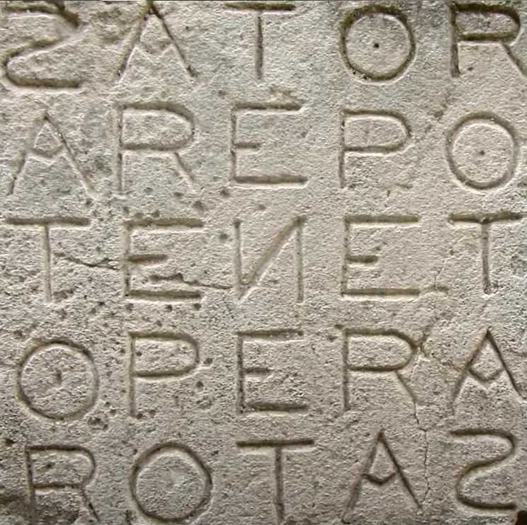 02 TENET 回文片名TENET,是一个很明显的回文结构单词,取自庞贝古城遗址的一块石碑遗迹,石碑上有一组拉丁文单词:Sator Arepo Tenet Opera Rotas。