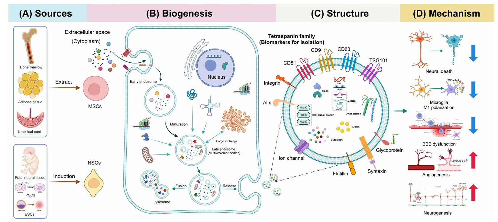 干细胞外泌体正是基于这一思路涌现的新方向。外泌体是细胞自然分泌的微小囊泡,直径约 30–150 纳米,可携带蛋白质、RNA、脂质等生物活性物质。它们能穿过血脑屏障,像“精准修复包裹”一样,将有益成分递送至损伤部位,从而抑制炎症、保护神经元、促进血管新生与神经修复。