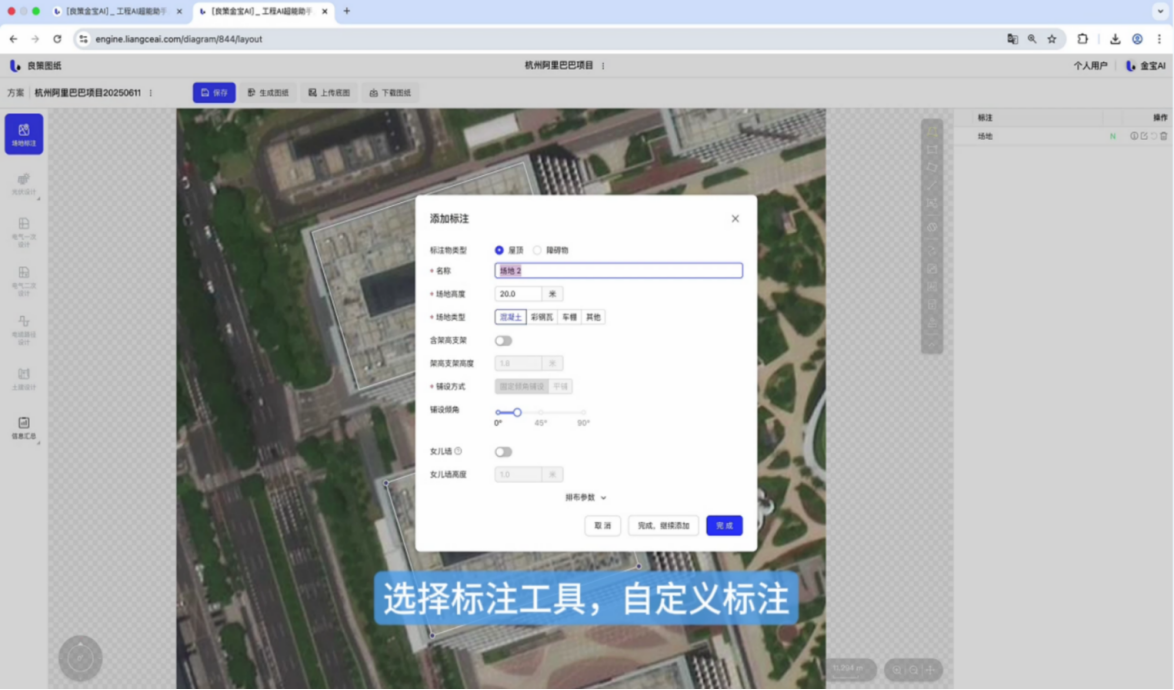 🔹 极简输入,零建模门槛用户仅需上传屋顶或地块的卫星图(支持 JPG/PNG 等常见格式),并在图上进行简单标注——如勾选可用区域、标记障碍物(电梯机房、女儿墙等)、选择铺设方式(平铺/倾角)、指定并网电压等级等。无需掌握CAD、PVsyst或Excel建模技能,开发人员、销售、项目经理均可操作。