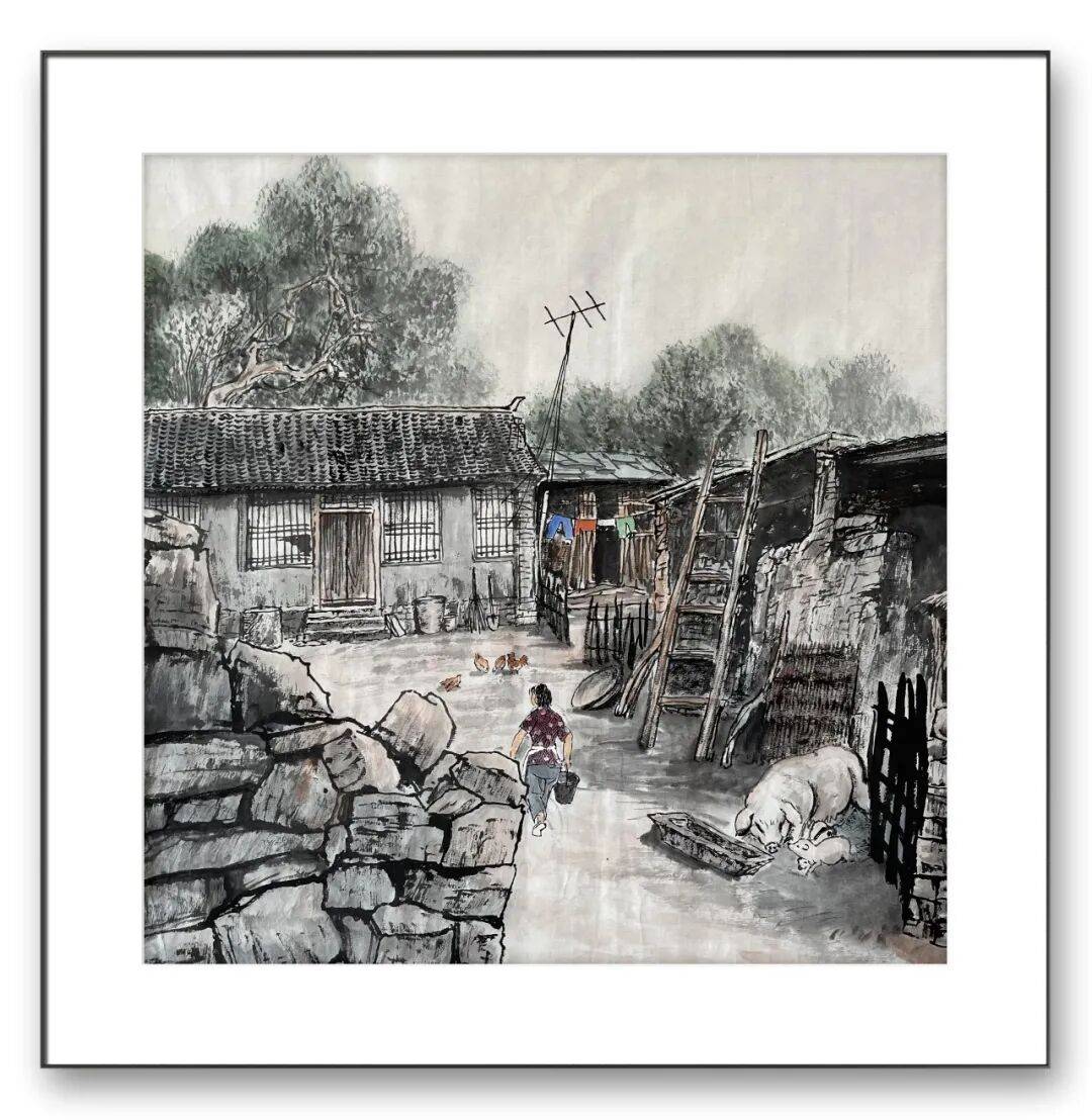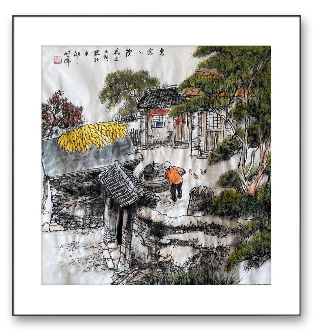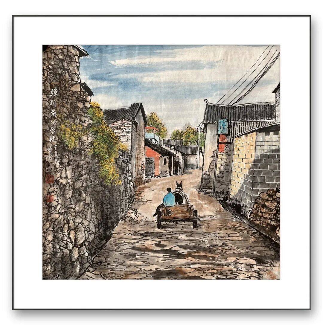 当笔墨褪去文人画的疏淡,转而拥抱泥土的温度,邵坚佛先生的乡村系列作品,便成了一卷卷能“闻”到烟火气的生活志。他笔下的村庄,从不是远山淡影的写意符号——是晒在屋顶的金黄玉米,是井边提桶的农妇与啄食的鸡群,是巷口闲话的邻里与蜷卧的土狗,是驴车碾过的石板路,是院里喂猪的妇人、墙根听故事的孩童。这些细碎的日常,被他用兼工带写的笔触“钉”在宣纸上:石墙的肌理、瓦楞的褶皱、衣物的褶皱,都带着生活的毛边;而淡墨晕染的远山、泼彩点染的树影,又让烟火气里飘着诗意的轻烟。