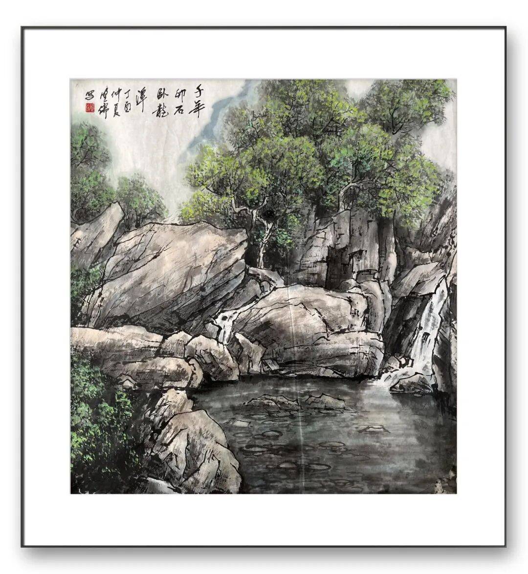 在具体的布局上,先生的画作层次分明,错落有致。近景处,苍松挺立,溪水流淌,坡石错落,细节刻画细腻入微,给人以清晰的视觉焦点;中景处,山峦叠嶂,林木丛生,云雾穿梭其间,起到了承上启下的过渡作用;远景处,淡墨轻染,山峦隐现,与天空融为一体,拓展了画面的空间感与纵深感。这种“咫尺之图,写千里之景”的构图技巧,使得画面虽小,却意境开阔,仿佛观者置身于山水之间,可游可居,可感可悟。此外,先生还善于运用留白的艺术,那些画面中的空白之处,并非空洞无物,而是云雾缭绕的虚空,是山涧潺潺的流水,更是观者心中无尽的遐想。留白的运用,让画面有了呼吸感与延展性,使得山水不再是被框定在宣纸中的风景,而是向远方无尽生长,引人无限遐思。