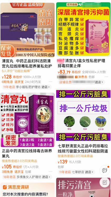 多款“清宫丸”同类产品在平台销售,主打“排污”“清宫”“抑菌”等功效,有的还暗示可应对多种炎症。平台截图