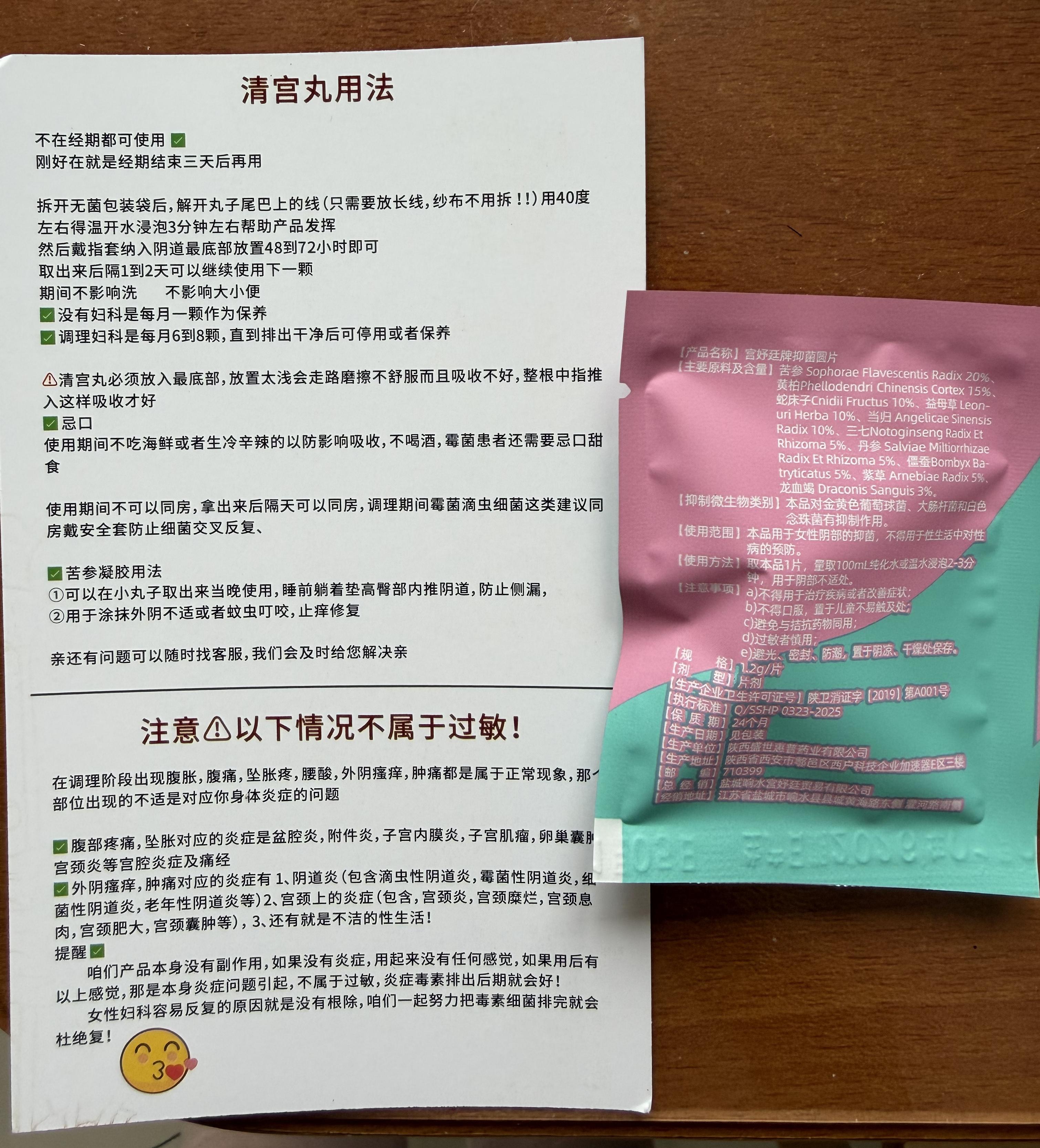 随快递包装附送的介绍“清宫丸”用法及注意事项的卡片。