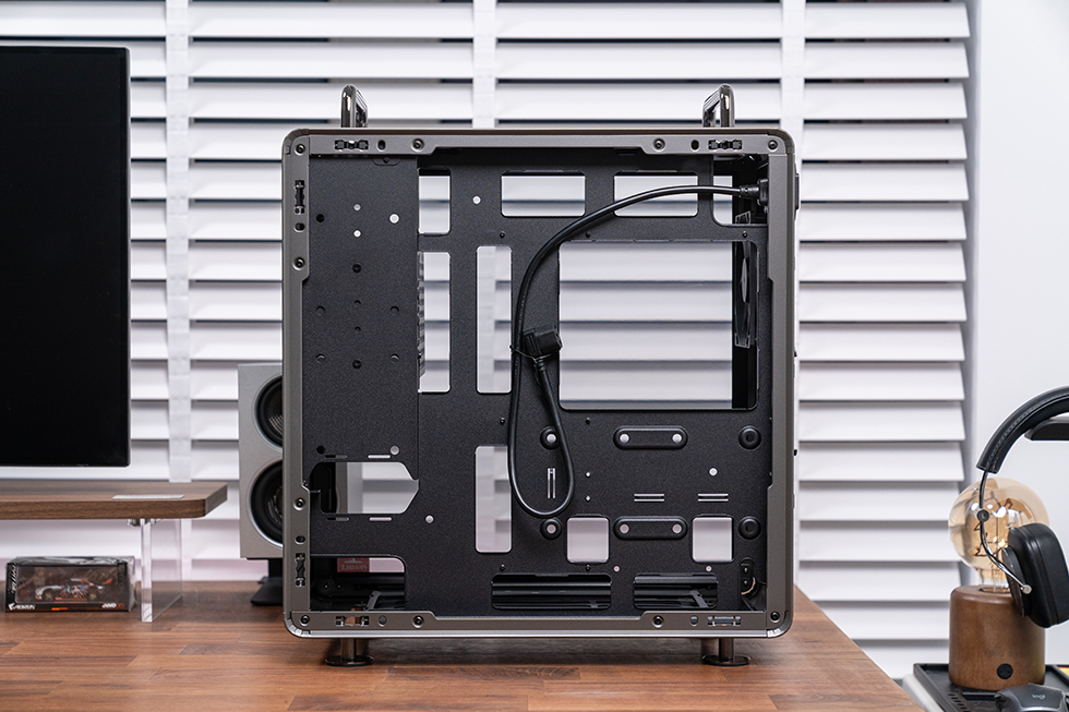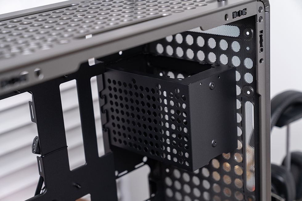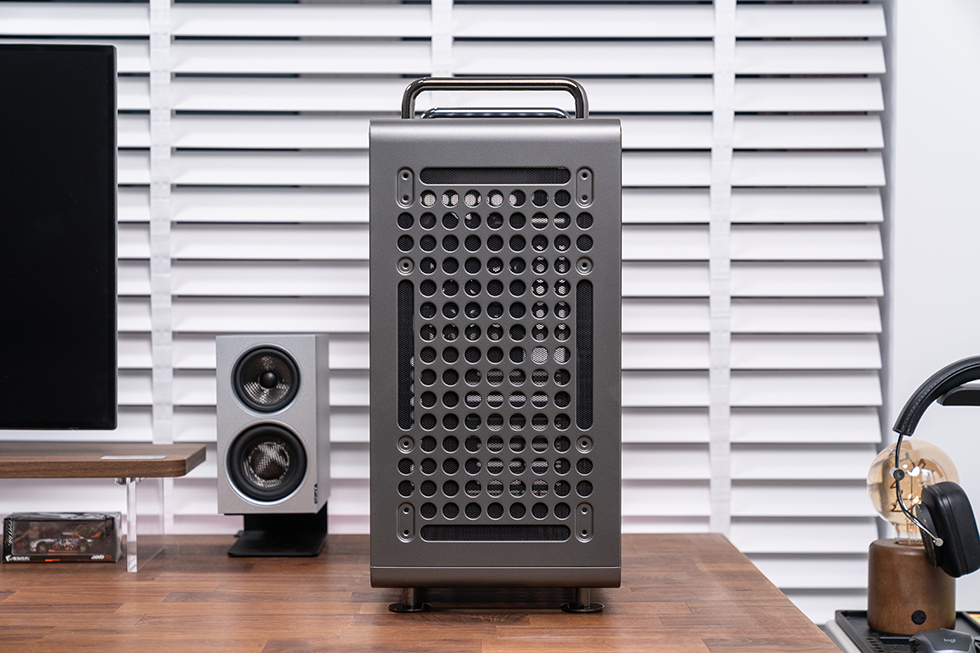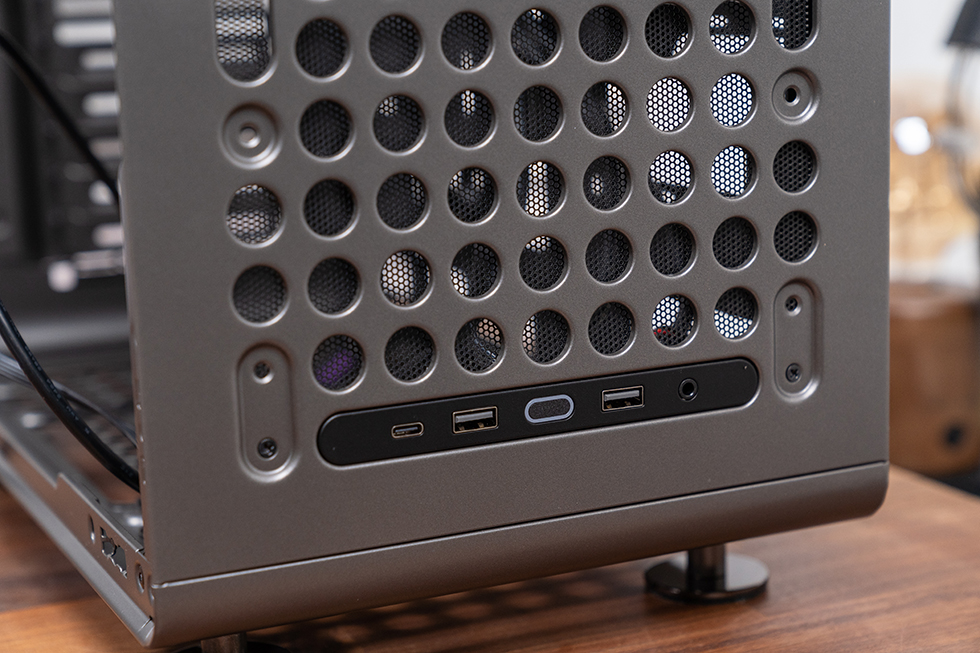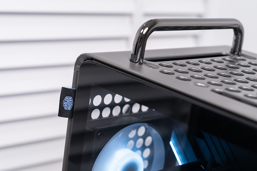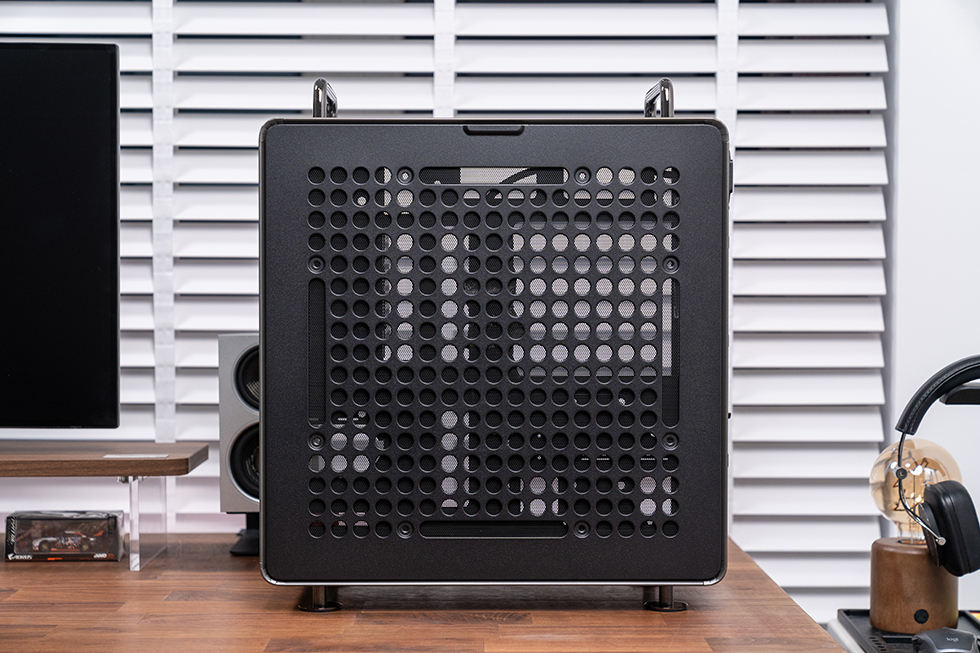 酷冷至尊 QUBE 酷方 540 延续了系列标志性的 “洞洞板” 设计,正面、顶面、底面及左侧面板均采用该结构,圆形开孔搭配新增的长条形孔洞,既保留了复古工业风的辨识度,又为功能扩展预留了空间。机箱提供星辰黑与月石灰两种配色,本次采用星辰黑款,以沉稳深邃的喷涂工艺呈现,搭配方正利落的机身线条,既能适配硬核电竞风格装机,也能融入简约桌面环境。
