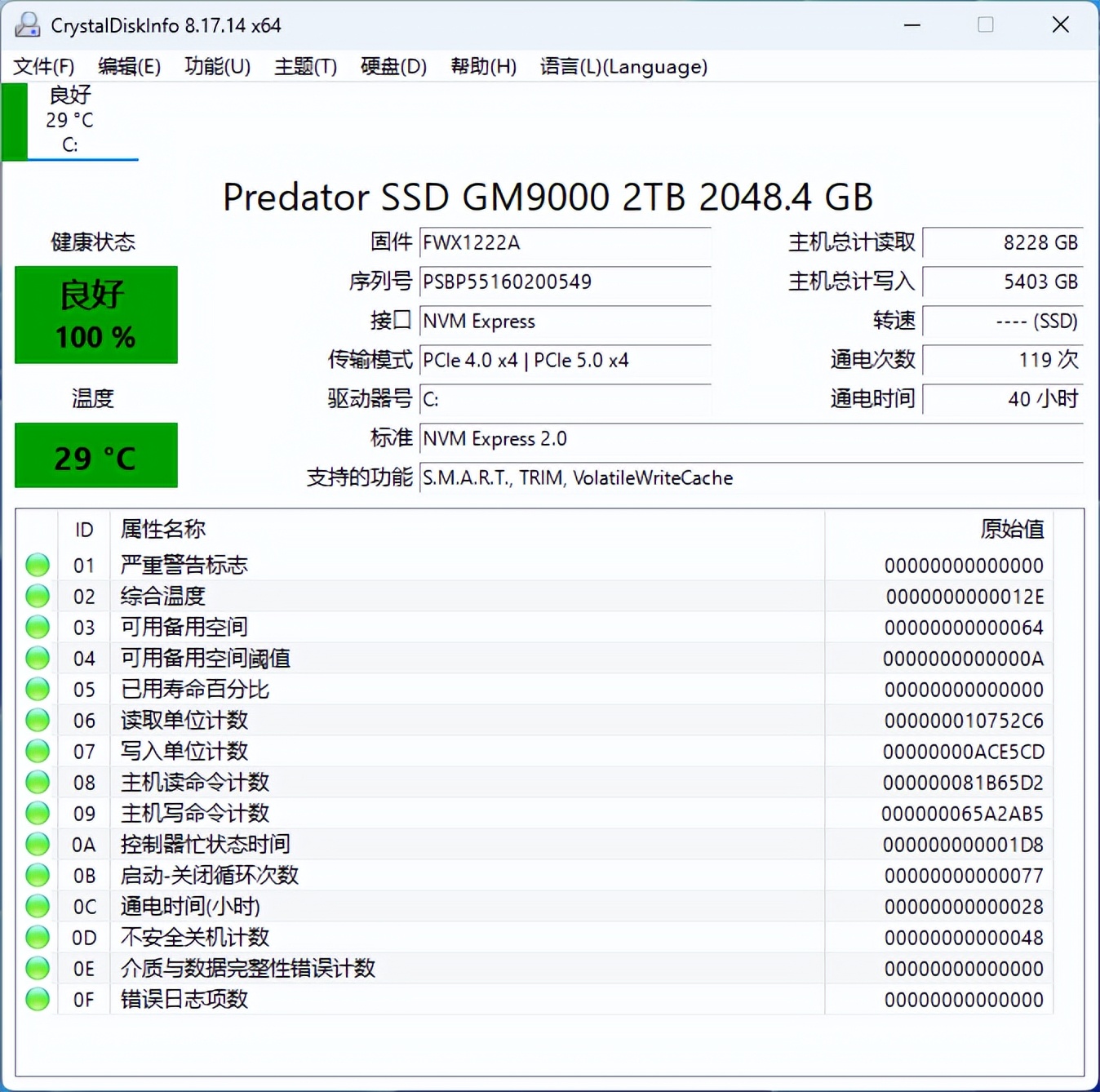SSD来自宏碁掠夺者:GM9000,支持最大带宽为 PCIe Gen5 x4,且遵循 NVMe 2.0 协议 。其 2TB版本的最大顺序读取速度可达 14000MB/s,最大顺序写入速度为 13000MB/s,2TB 版本提供 1600TBW,产品附带 5 年的有限保修服务 。标准M.2 2280规格, 采用单面颗粒设计,黑色PCB,表面为带有掠夺者LOGO涂装的有薄铜箔石墨烯散热贴。背面没有任何元器件以及NAND芯片的扩展焊盘,仅有各种认证标识及SN条形码的贴纸。单面板轻设计相比双面元件的产品发热量更低,对于内部空间狭窄的笔记本电脑级PS5等设备有更好的兼容性。