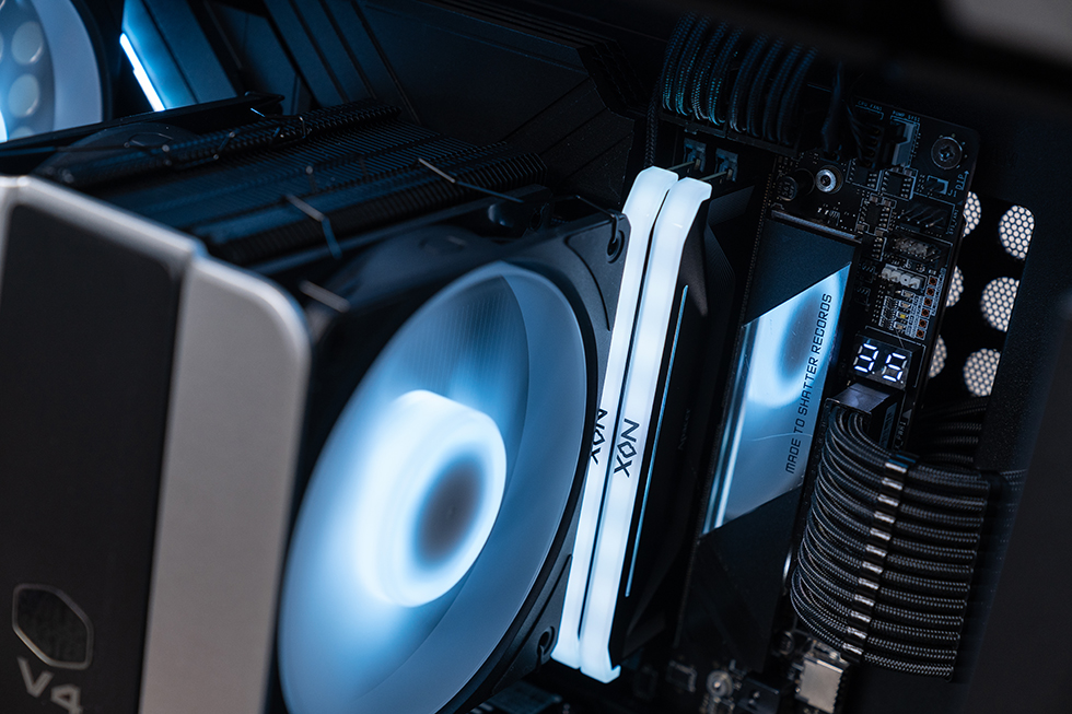 内存则选用了宇瞻全新的NOX RGB DDR5 内存,采用海力士原厂颗粒,单条容量16GB,支持Intel XMP3.0与AMD EXPO™单键超频技术,选择了AMD平台的黄金时序C28。开启XMP后,频率则为6000Mhz,时序 28-48-48-96 CR1,内部搭载PMIC(电源管理芯片),能有效管理电流,确保系统稳定高效运行。