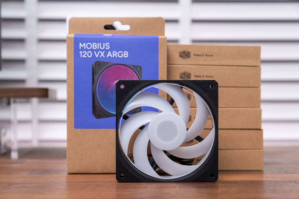 机箱风扇采用酷冷至尊的莫比乌斯120 VX ARGB,采用动态回油轴承,环形连叶型结构+几何防震扇框设计。速区间 0~2400+10% RPM,最大风量 75.2 CFM,最大静压 2.69 mmH2O,最大噪声 30 dB(A)。