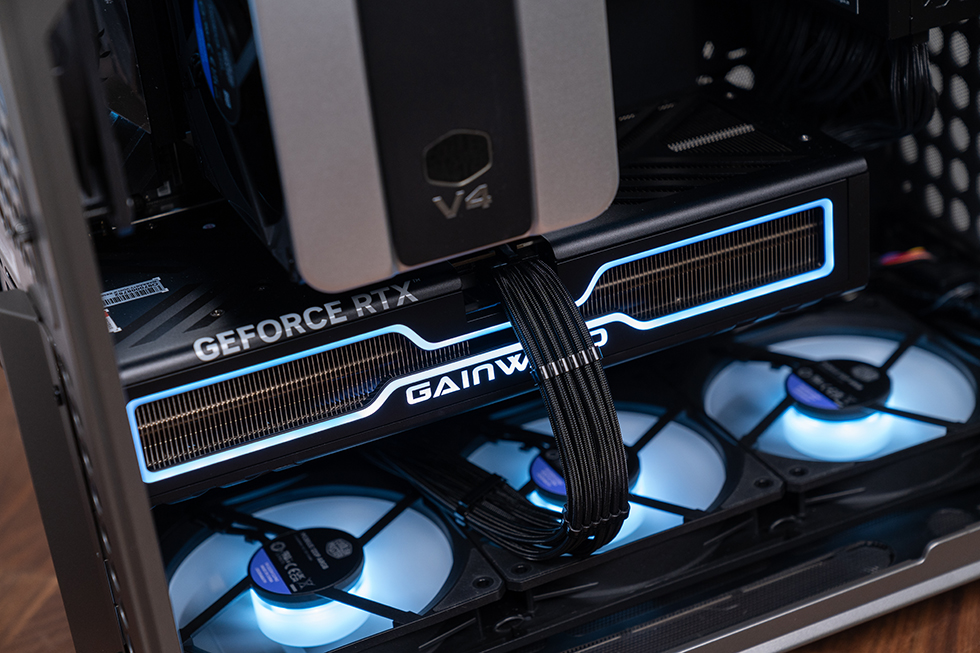 整机采用风冷方案,CPU散热为酷冷至尊挑战者 V4,采用单塔外形,高度为 158mm,顶部配有磨砂质感的引擎盖造型顶盖,提升了外观的视觉层次与质感,整体外观设计简约。