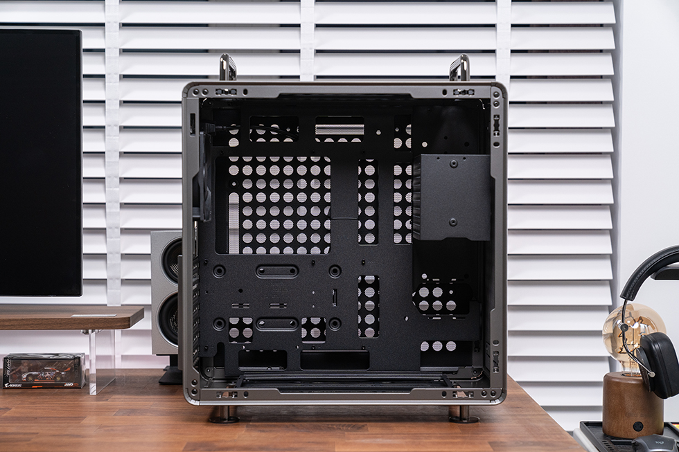 机箱整体尺寸为425×225×425 mm,内部容积达 40.64L。采用钢材与钢化玻璃组合材质,洞洞板的开孔边缘切割整齐,无毛刺残留,表面喷涂工艺细腻,触感顺滑且耐磨耐脏。侧透钢化玻璃通透度出色,能完整呈现内部硬件灯光与布局。机箱新增可拆卸金属提手,不仅提升了搬运便利性,还支持调整安装位置,解锁平放等多种使用姿态,进一步丰富了场景适应性。