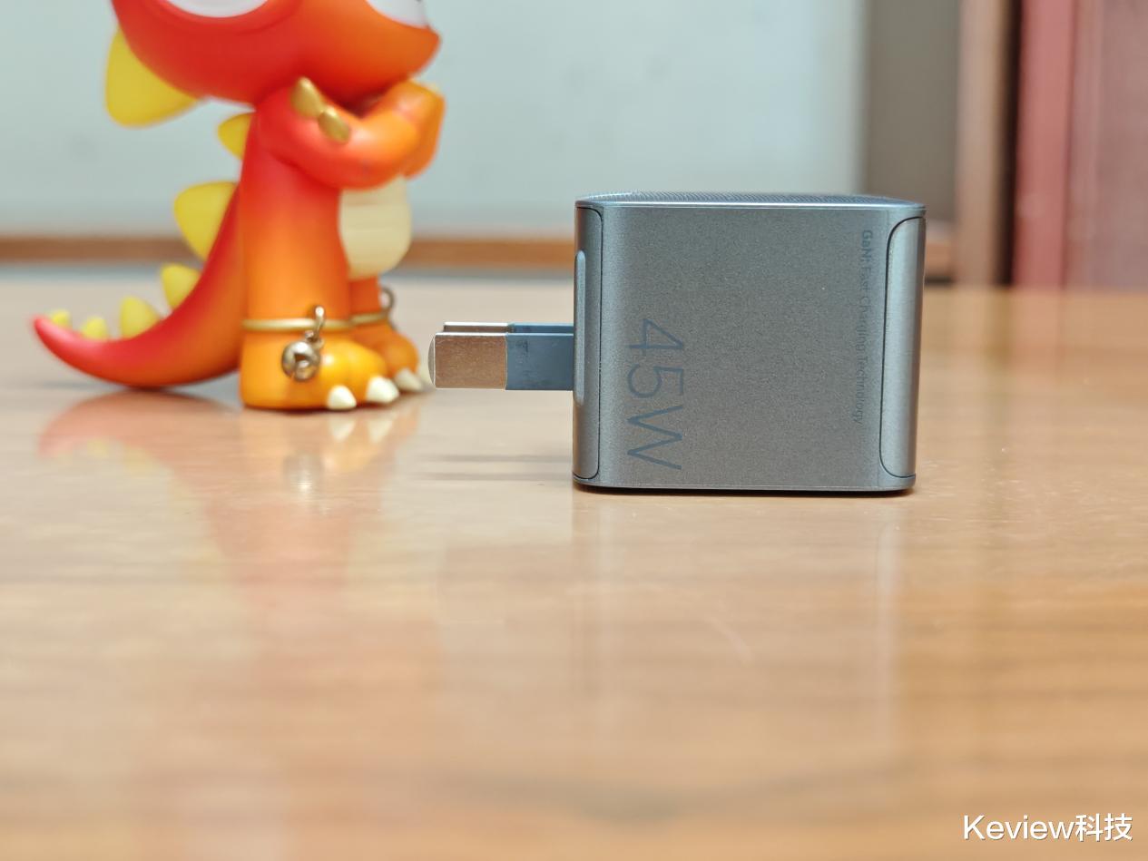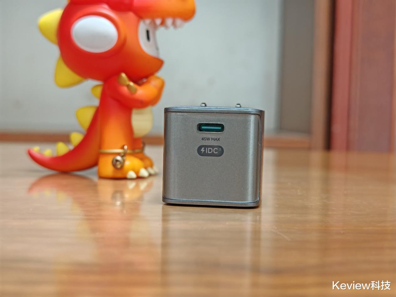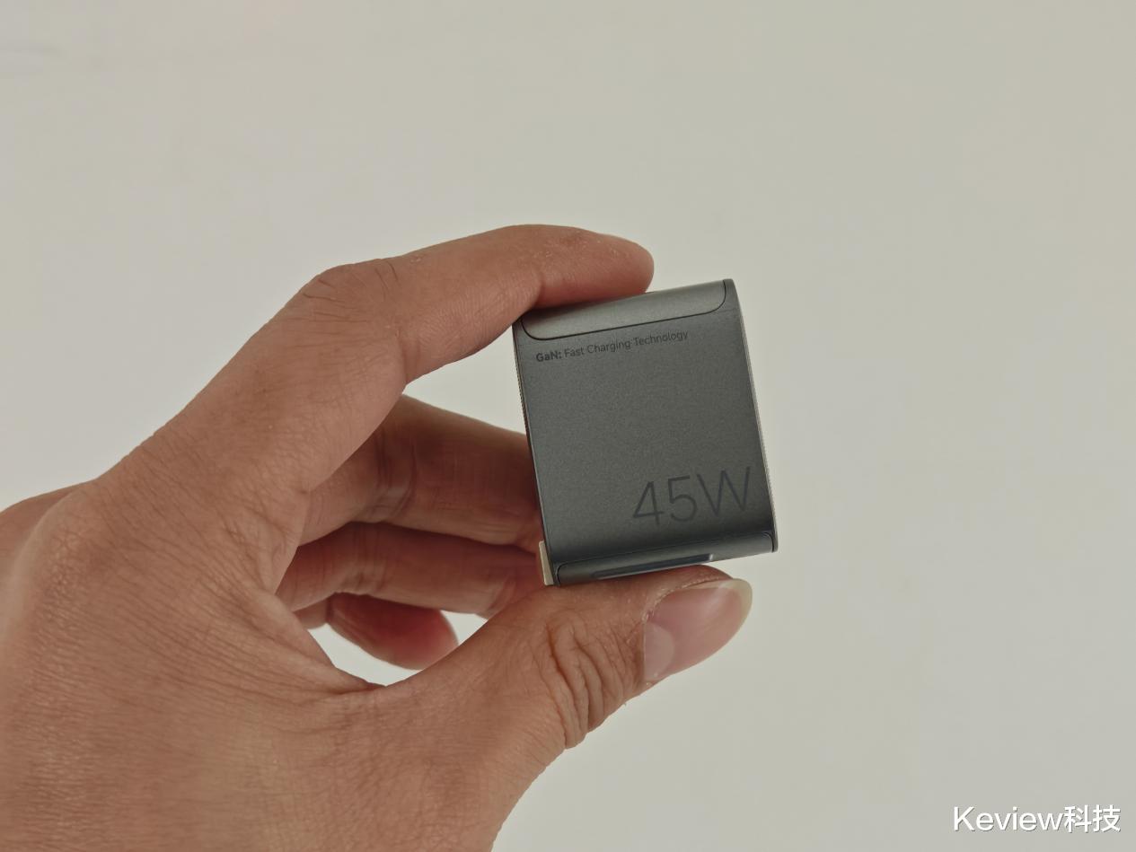 米物小魔方45W氮化镓充电器CA345采用了苹果科技新美学,拥有钛金属质感外观。顶部是微哑光透明面板,机身呈现钛银灰金属质感,还雕刻着3D丝滑纹理,看起来科技感十足。它的R角设计和iPhone 17同款,手感温润,浑然一体。圆润插脚设计,收放顺畅,在插拔充电器时能很好地呵护双手。整体外观不仅颜值高,而且手感舒适,放在桌上也是一件不错的装饰品。