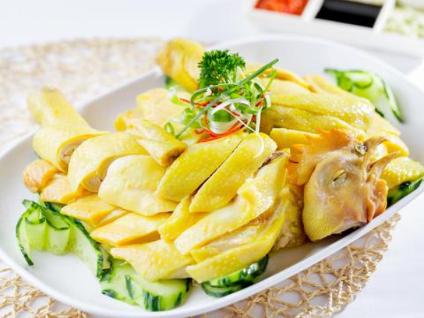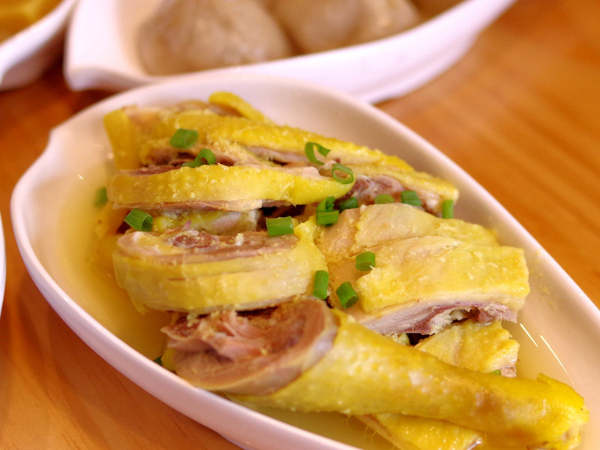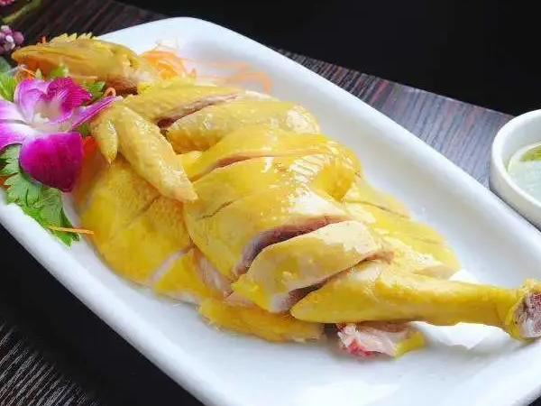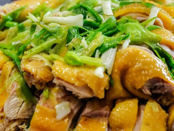 把葱花、葱段、生姜和少量的盐巴混合在一起,做成酱料,倒入麻油和沸水,做成酱料(也可以放在锅里煮),盛在盘子里。把整只鸡都放在一个大锅里,倒入清水,用小火炖上一两个时辰(根据鸡肉的质量不同,母鸡用的是短促的,公鸡用的是更久的),直到鸡肉的表皮变得金黄,肉质细软(烹制的时候要小心火候,也要小心把鸡肉翻过来,这样才不会有表皮开裂的情况发生),捞出来晾一晾,剁碎鸡肉,整整齐齐的装盘。