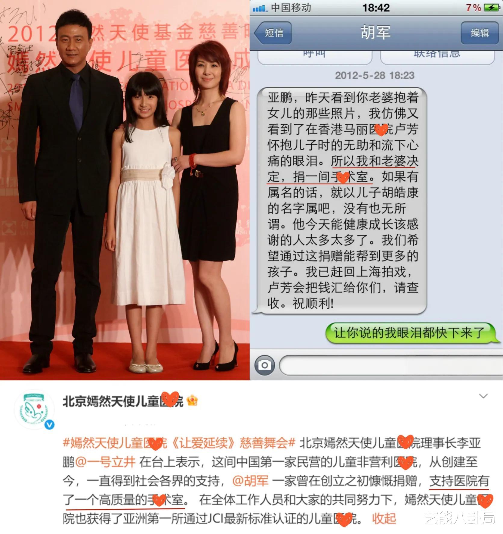 胡军在发给李亚鹏的短信中写道:“亚鹏,昨天看到你老婆抱着女儿的那些照片,我仿佛又看到了卢芳怀抱儿子时的无助和流下心痛的眼泪。所以我和老婆决定,捐一间手shu室。”