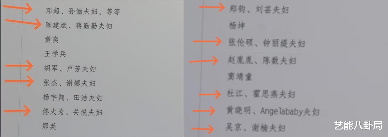 邓超孙俪、陈建斌蒋勤勤、胡军卢芳、张杰谢娜、佟大为关悦、郑钧刘芸、张伦硕钟丽缇、陈数夫妇、杜江霍思燕、黄晓明夫妇、吴京谢楠……