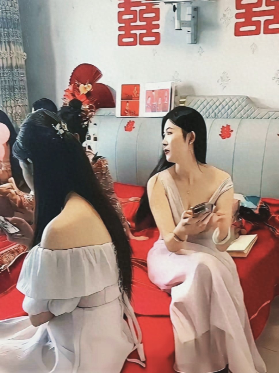 两人的手有不经意间的触碰在一起,但又同时缩了回去。然后一起笑出了声,坐在正堂的男方母亲接过新娘递过来的茶杯时,突然眯着眼打量着他俩。