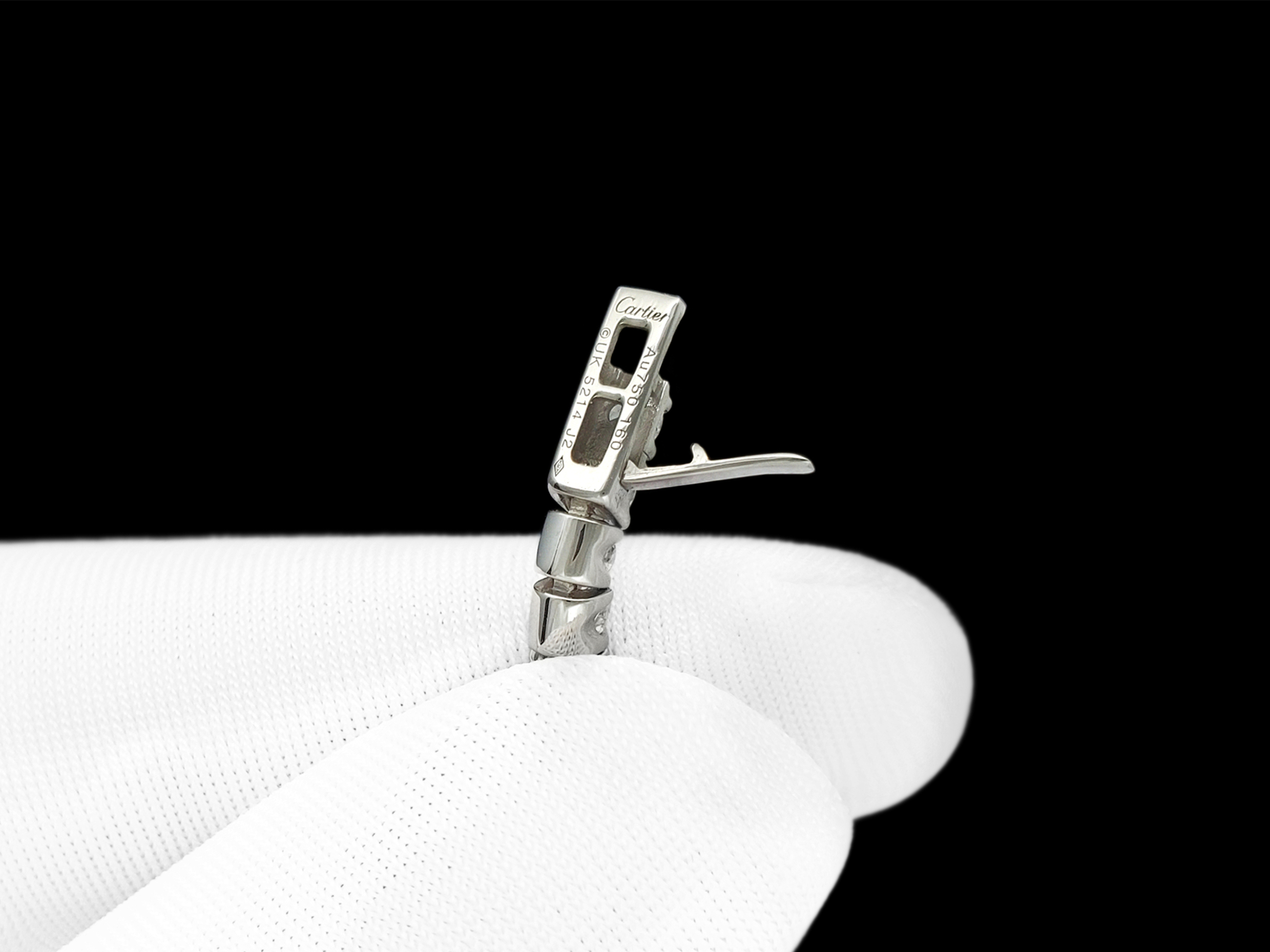 手链两端分别为开关组件。佩戴时,只需将的“鸭舌卡扣”插入进的K金匣仓内,再合上侧方位的保险,非常牢固。摘取时,仅需下压装置上方最右侧的钻石,利用弹性将卡扣打开,单手即可完成操作。此外,卡地亚的刻字信息均位于开关部位的内侧。