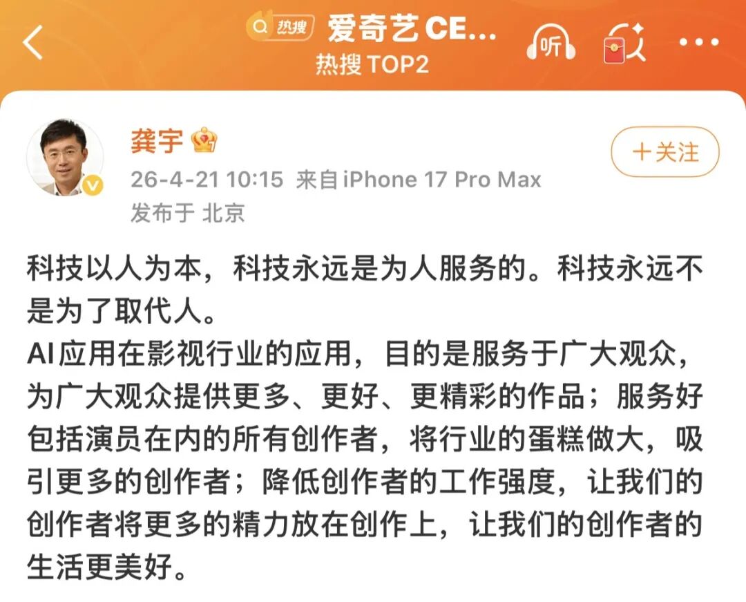 真正引爆舆论的,或许与爱奇艺创始人、CEO龚宇在会上的几段超前发言有关,“AI能让演员从一年演4部戏增至14部”,“未来真人实拍或成非遗”等言论被单拎出来,瞬间让观众和粉丝群体陷入真实感丧失的恐慌,也让艺人团队感到了前所未有的危机感。