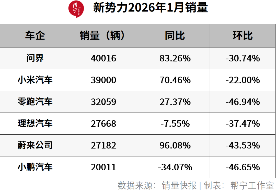 去年的新势力销冠零跑汽车,今年1月交付32059辆,同比增长27.37%,但环比下滑46.96%。旗下D系列新车型完成冬季测试,一季度将推出入门级车型A10,有望进一步拉动整体销量,但零跑能否保持2025年的高速增长,还有待观察。
