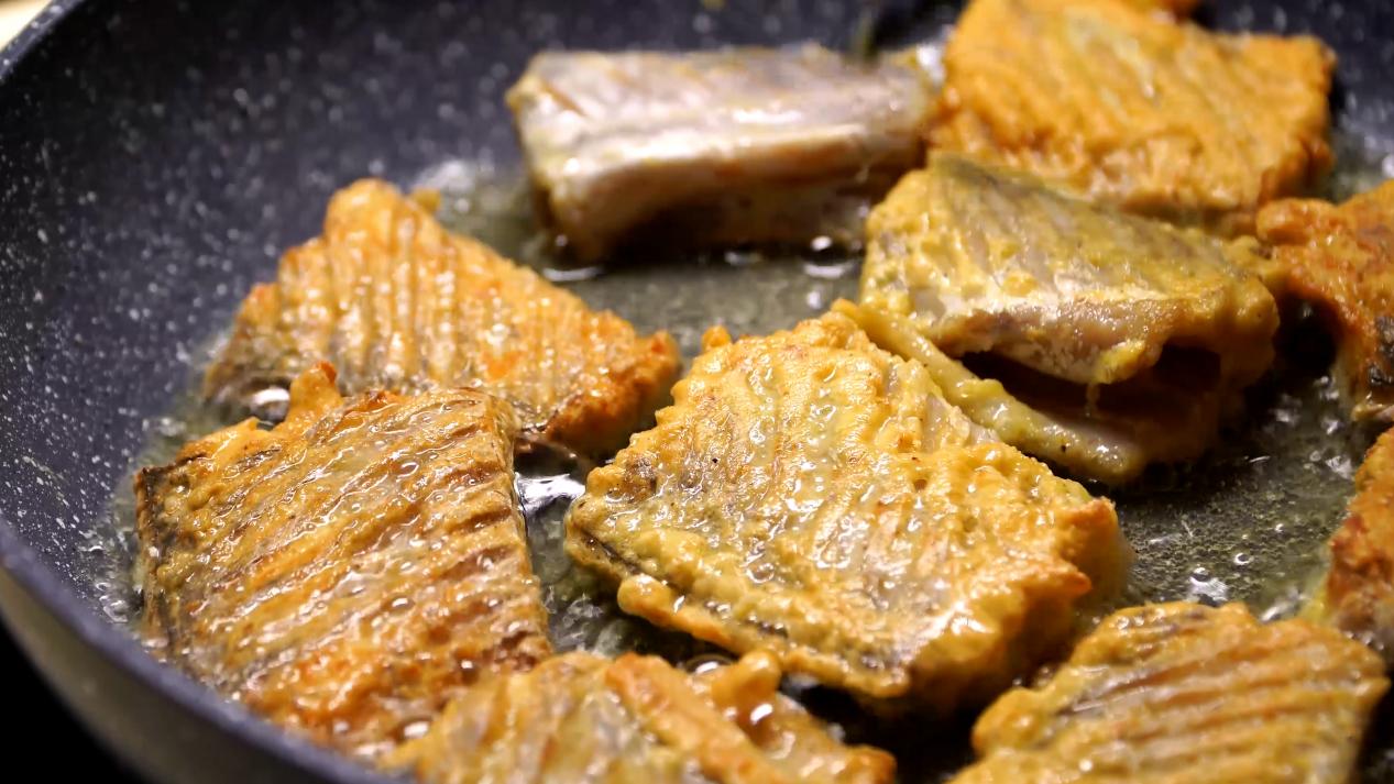 油温七成热,微微冒烟,下入带鱼,高油温可以使带鱼快速定型,防止粘锅。先不要翻动,一面煎好后再煎另一面,两面金黄就可以了。