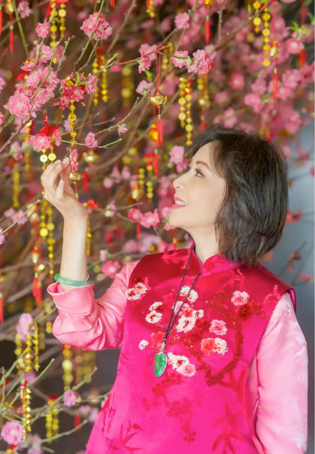 春节则会穿上中式服装,戴上传统(且昂贵)的翡翠首饰,和桃花树合影……