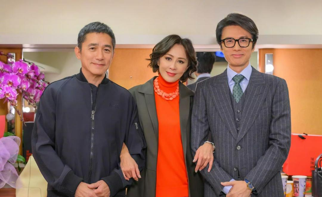 刘嘉玲和剧组人员开心庆祝,梁朝伟也过来探班合影。