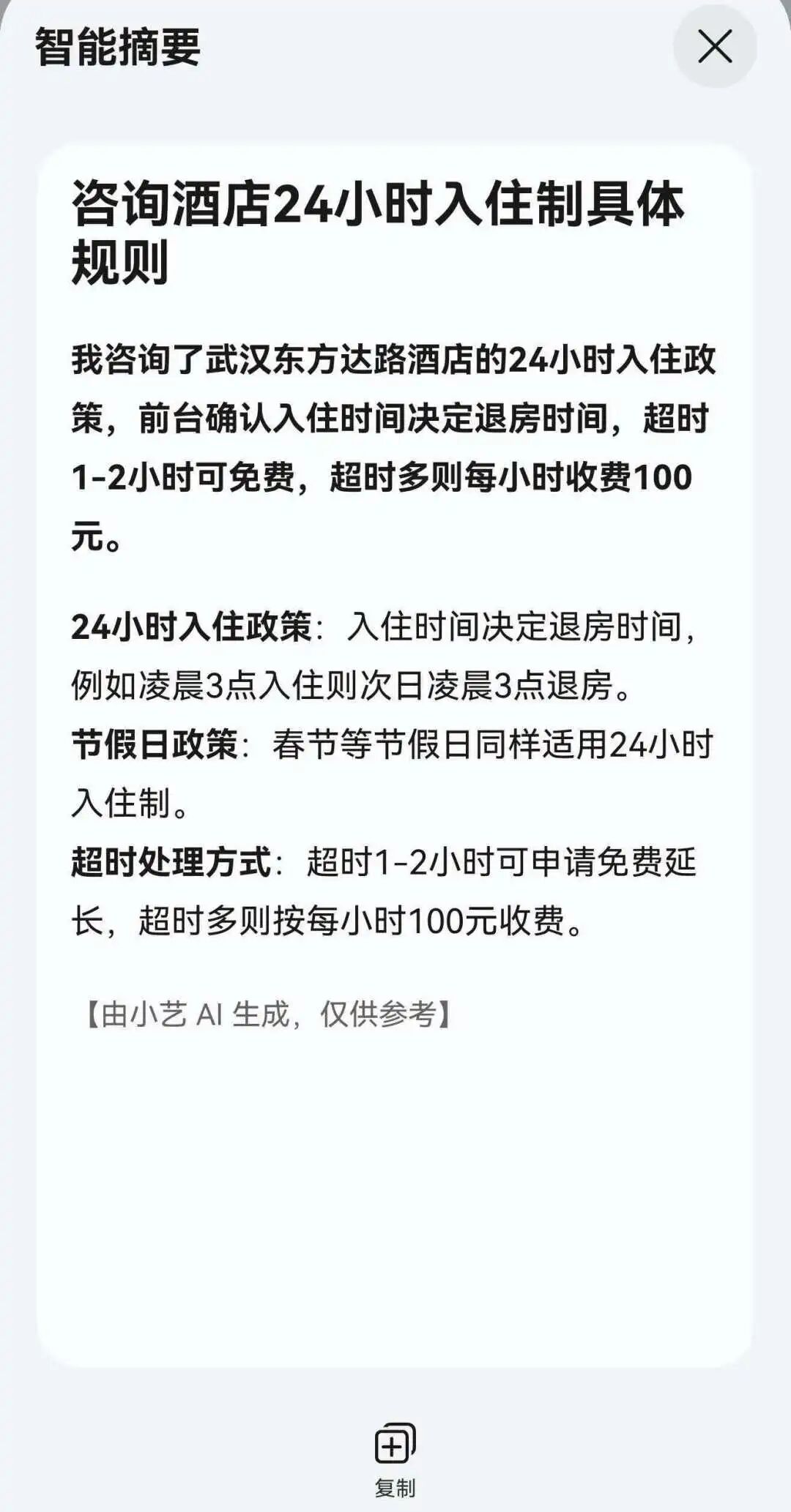 我问:“你们那个24小时退房,春节也执行吗?我要是大年三十晚上10点入住,可以住到初一晚上10点?”