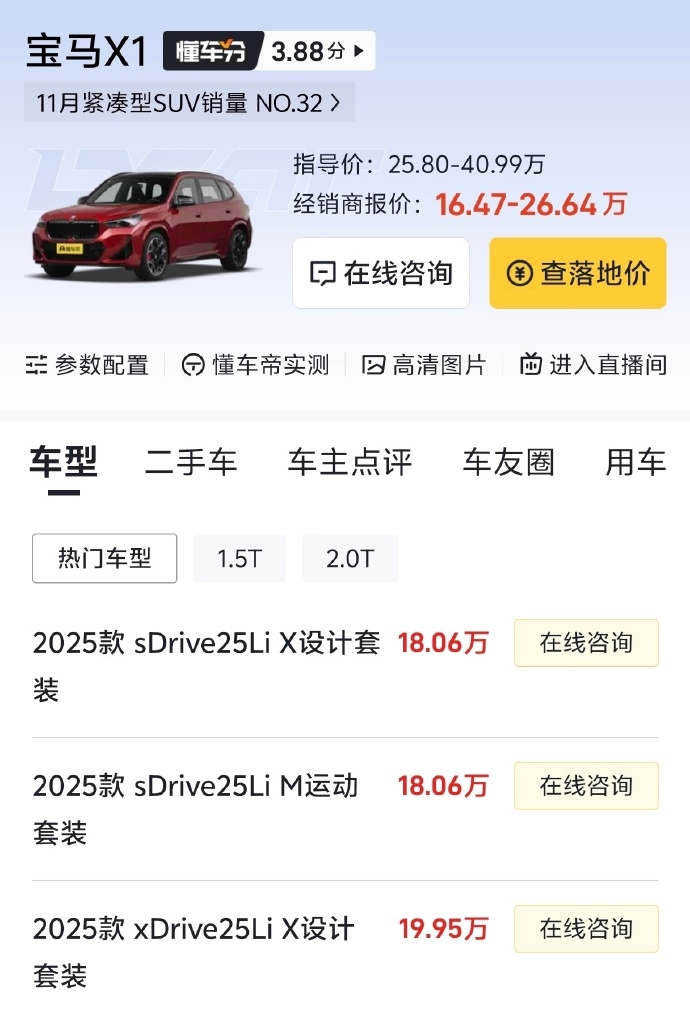 宝马X1系列也同步调整,例如 X1 xDrive25Li 从 34.99 万元降至 28.88 万元,降幅为 18%。