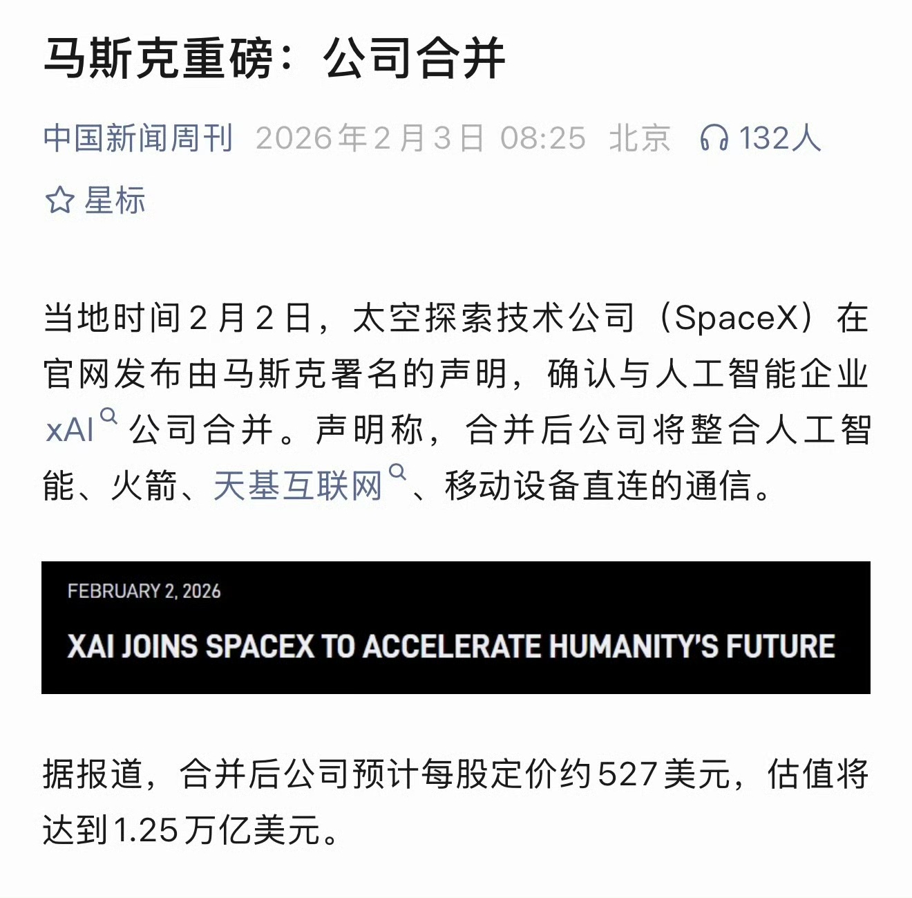 全球科技界迎来历史性一刻!北京时间2026年2月3日,SpaceX官方正式官宣,已完成对同属马斯克旗下的人工智能公司xAI的全资收购,两家公司正式合并为一体,合并后新实体估值高达1.25万亿美元,一跃成为全球最具价值的私营企业。此次合并并非简单的资本联姻,核心是整合人工智能、火箭发射、天基互联网、移动设备直连通信四大领域,而外界最关注的是,这是否意味着马斯克承诺的100万颗卫星星座计划,将加速落地、正式提上日程。