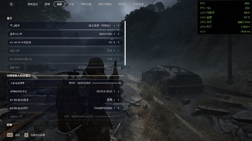 在DLSS 4与DLSS 4.5的画面对比中,能感受到DLSS 4.5超分辨率在画面精细度上的提升,角色背部的武器与背包的物理结构及金属部件的纹理更锐利、边缘轮廓更清晰,枪械的细节褶皱都没有了轻微的模糊感。再看场景,DLSS 4.5 下近景废弃车辆的锈迹、碎石的纹理、色彩的过渡更加自然;远景上,树木的枝叶轮廓、远处建筑的细节都更分明,层次感更足,使末日废土的游戏画面更有写实感。