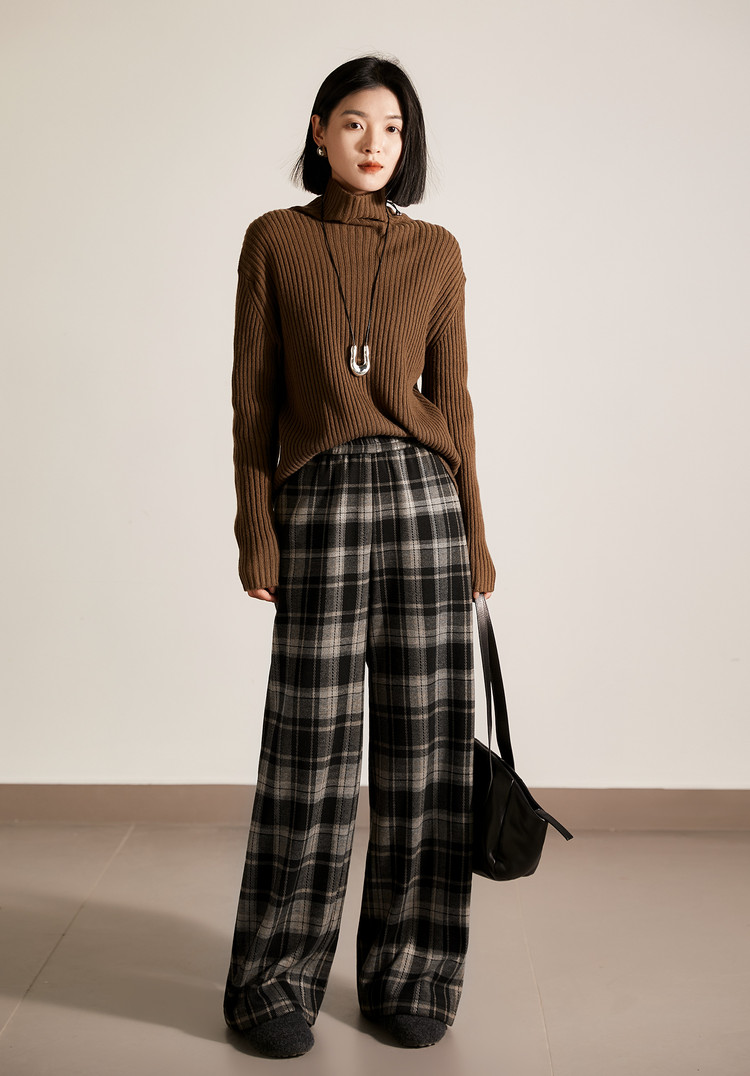 一件软糯的焦糖色毛衣,搭配复古咖色格子阔腿裤,将深浅不一的暖色调叠穿出层次感,如同捧在手心的热咖啡般温暖治愈。